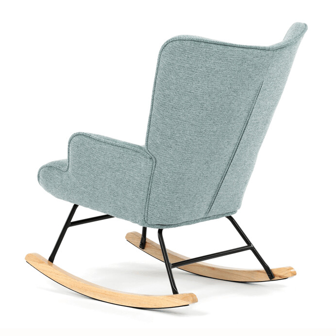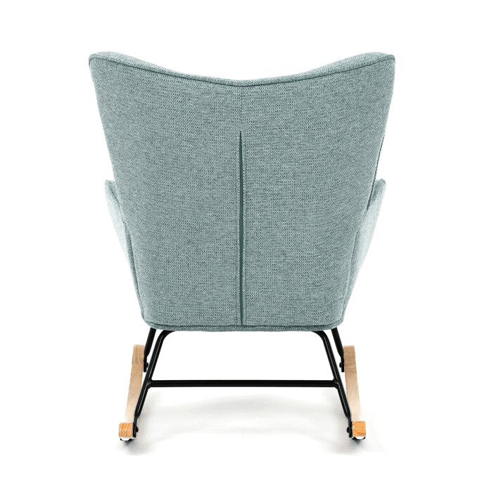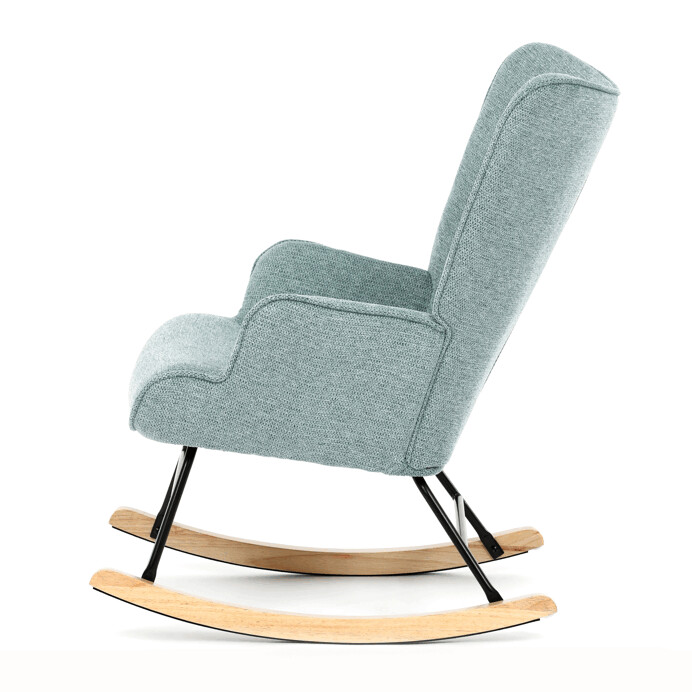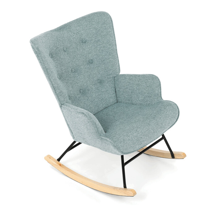 Hojdacie kreslo v modrom prevedení je potiahnuté prémiovou látkou, ktorá ponúka príjemný dotyk a jednoduchú údržbu. Sedák a operadlo sú ergonomicky tvarované pre pohodlné sedenie, doplnené o pevné čalúnené podrúčky. Stabilné nohy sú vyrobené z masívneho kaučukovníka a doplnené o čierny kovový rám, ktorý zabezpečuje pevnosť a dlhú životnosť. Hojdací mechanizmus umožňuje plynulé hojdanie, ktoré prispieva k relaxácii a oddychu. Kreslo je určené do interiérov s dôrazom na komfort a štýl, jeho rozmery a nosnosť zodpovedajú bežným štandardom pre hojdacie kreslá.