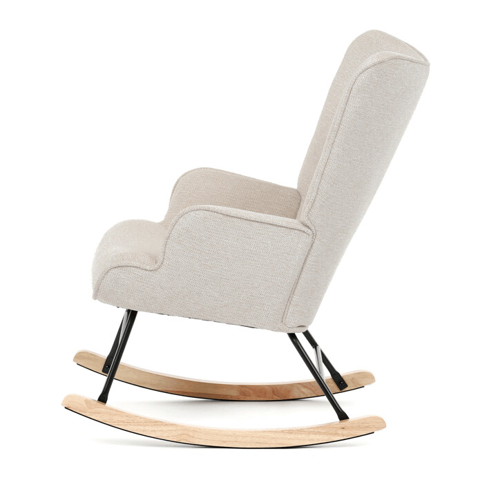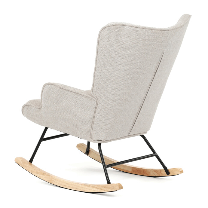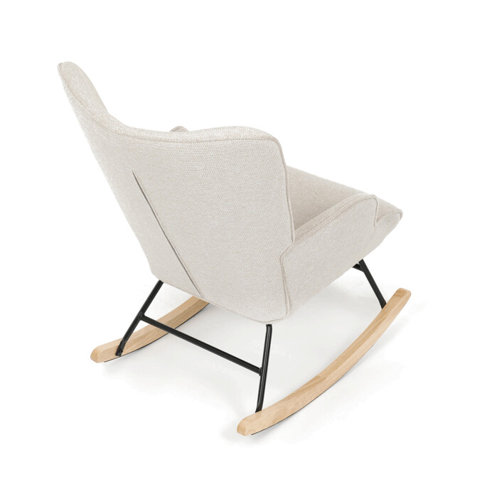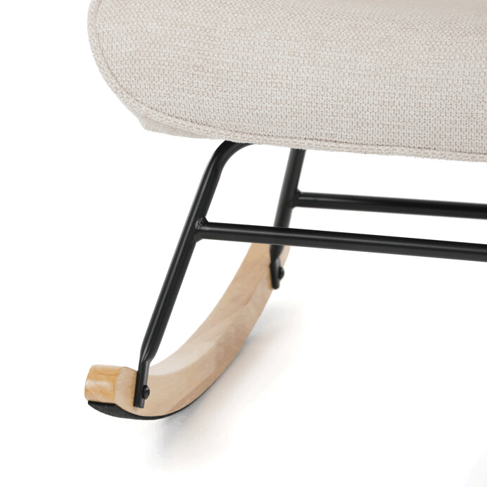 Hojdacie kreslo s béžovým čalúnením z prémiovej látky ponúka pohodlné posedenie s jemnou textúrou, ktorá je príjemná na dotyk a ľahko sa udržiava. Sedák a operadlo sú ergonomicky tvarované a doplnené o pevné podrúčky pre maximálny komfort. Stabilné nohy sú vyrobené z kombinácie čierneho kovu a masívneho kaučukovníka, čo zabezpečuje pevnosť a dlhú životnosť. Hojdací mechanizmus umožňuje plynulé a tiché hojdanie, ktoré prispieva k relaxácii. Kreslo je vhodné do moderných aj klasických interiérov, jeho rozmery a nosnosť zodpovedajú bežným štandardom pre pohodlné sedenie.