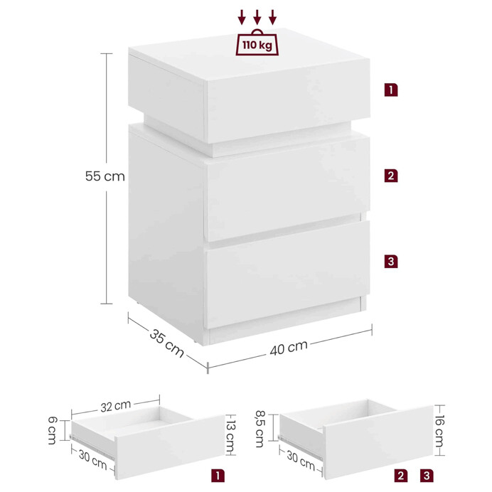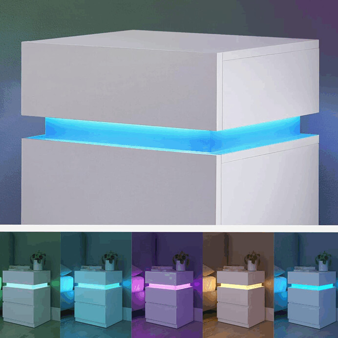 Nočný stolík ANT-E1163 WT z MDF v bielom prevedení ponúka praktický úložný priestor v dvoch zásuvkách s hladkým povrchom a bezúchytkovým otváraním. Jeho minimalistický dizajn dopĺňa integrované LED osvetlenie s modrým svetlom umiestnené medzi hornou doskou a telom stolíka, ktoré vytvára jemnú atmosféru a zároveň uľahčuje orientáciu v priestore. Stolík je vybavený napájacím káblom s ovládacím tlačidlom pre jednoduché zapnutie a vypnutie osvetlenia. Vďaka kompaktným rozmerom a kvalitnému bielemu matnému dekoru je vhodný do moderných interiérov spální aj obývacích izieb.