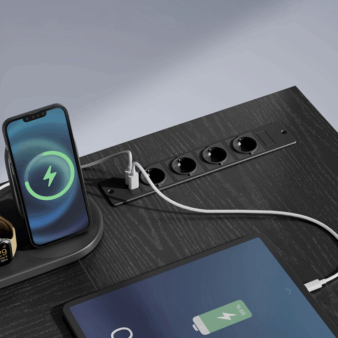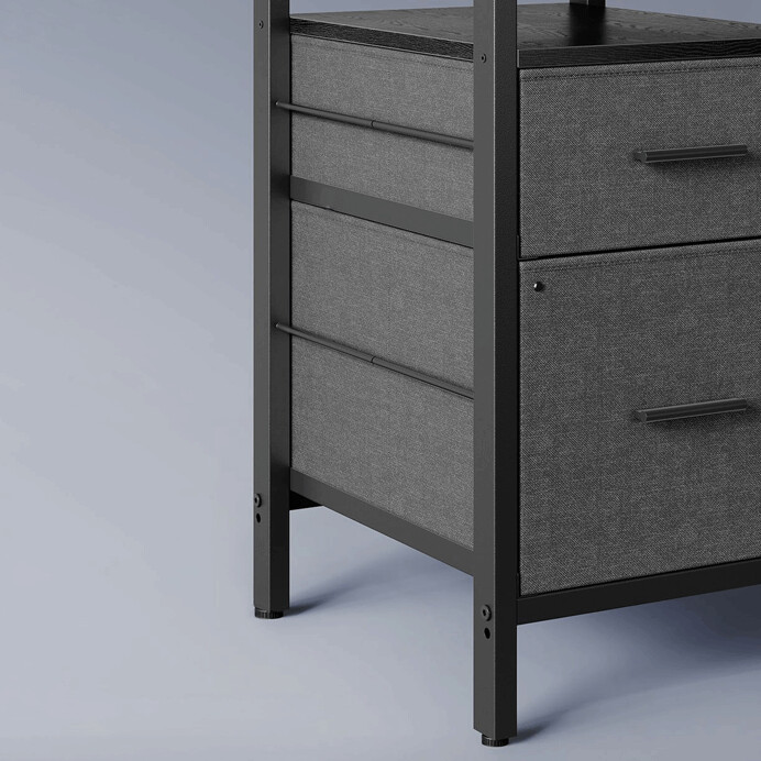 Rohový PC stôl APC-E1395 BK v čiernom prevedení ponúka praktické riešenie pre efektívne usporiadanie pracovného priestoru. Doska stola je vyrobená z MDF s čiernym dekorom, ktorý sa ľahko udržiava a je odolný voči bežnému opotrebovaniu. Stabilné kovové nohy zabezpečujú pevnú oporu a dlhú životnosť. Súčasťou stola sú dve látkové zásuvky poskytujúce dostatok úložného priestoru na dokumenty či kancelárske potreby, ako aj otvorená polica pod doskou pre ďalšiu organizáciu. Integrované elektrické zásuvky a USB porty umožňujú pohodlné pripojenie elektroniky priamo pri pracovisku, čo zvyšuje komfort a efektivitu práce.