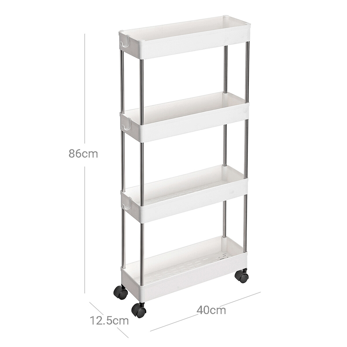 Pojazdný úložný vozík so štyrmi policami ponúka praktické riešenie na organizáciu drobných predmetov v domácnosti či kancelárii. Police sú vyrobené z bieleho plastu, ktorý sa ľahko udržiava, a sú prepojené kovovými tyčami zabezpečujúcimi stabilitu celého vozíka. Vozík je vybavený plastovými kolieskami, ktoré umožňujú jednoduchú manipuláciu a presun v priestore. Kompaktné rozmery a otvorená konštrukcia políc uľahčujú prístup k uloženým veciam a zároveň šetria miesto.