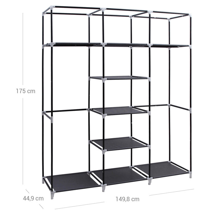 Látková šatní skriňa v čiernom prevedení ponúka praktické riešenie úložného priestoru pre odevy a doplnky. Jej pevná kovová konštrukcia zabezpečuje stabilitu a dlhú životnosť, zatiaľ čo čierna látka chráni obsah pred prachom a nečistotami. Skriňa je vybavená tromi závesnými tyčami na zavesenie oblečenia a tromi policami v strede na uloženie zložených vecí alebo krabíc. Predná časť sa dá jednoducho stiahnuť pomocou rolovacích pásikov, čo umožňuje rýchly prístup k obsahu. Vďaka kompaktným rozmerom a ľahkej konštrukcii je vhodná do menších priestorov aj ako doplnkový úložný systém.