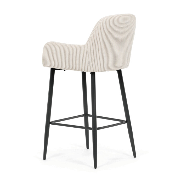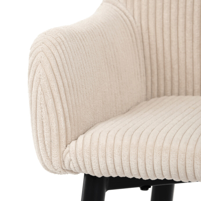 Barová stolička s podrúčkami v béžovom manšestrovom poťahu spája pohodlie a moderný dizajn. Sedák aj operadlo sú čalúnené príjemnou manšestrovou látkou, ktorá ponúka mäkký povrch s jemnou textúrou a jednoduchú údržbu. Pevné kovové nohy v čiernom matnom prevedení zabezpečujú stabilitu a dlhú životnosť, pričom spodná priečna výstuž slúži zároveň ako praktická opierka nôh. Stolička nie je otočná, čo podčiarkuje jej jednoduchý a elegantný tvar vhodný do barov, kuchynských ostrovčekov či vysokých stolov. Vďaka ergonomicky tvarovaným podrúčkam poskytuje dostatočnú oporu pre ruky a prispieva k pohodlnému sedení.