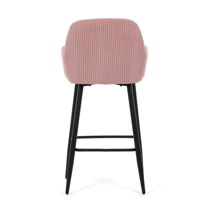 Barová stolička s podrúčkami v ružovom manšestrovom poťahu spája pohodlie s moderným dizajnom. Sedák a operadlo sú čalúnené mäkkou manšestrovou látkou, ktorá ponúka príjemnú textúru a jednoduchú údržbu. Pevné čierne kovové nohy zabezpečujú stabilitu a dlhú životnosť, pričom spodná priečna výstuž slúži zároveň ako praktická opierka na nohy. Stolička nie je otočná, čo podčiarkuje jej jednoduchý a elegantný vzhľad vhodný do barových priestorov aj kuchynských kútov. Vďaka ergonomicky tvarovaným podrúčkam poskytuje dostatočnú oporu pre ruky počas sedenia.