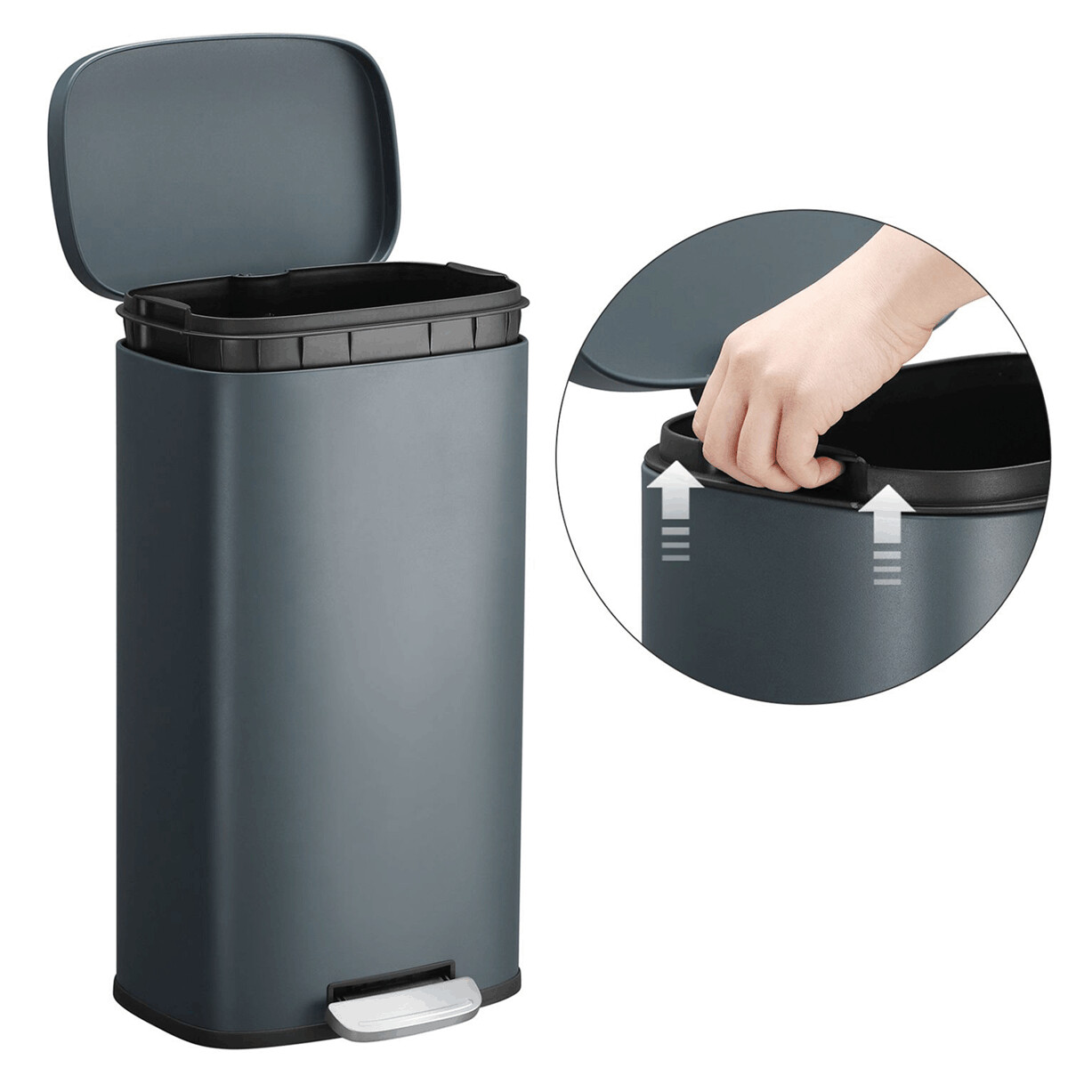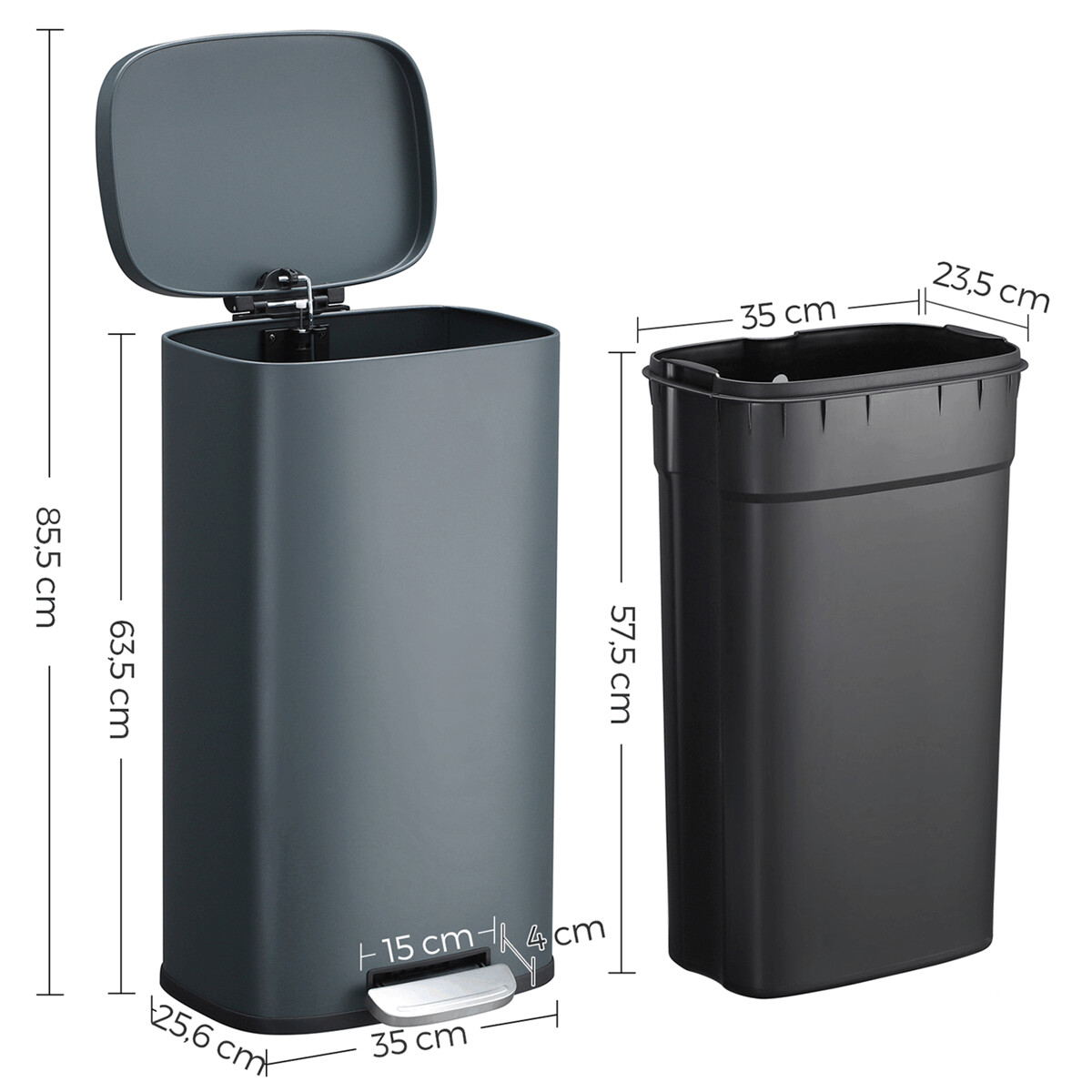 Odpadkový kôš s objemom 30 litrov v čiernom kovovom prevedení ponúka pevné a stabilné riešenie pre každodennú likvidáciu odpadu. Vďaka praktickému pedálu je možné veko otvárať bez použitia rúk, čo zvyšuje hygienu a pohodlie pri používaní. Kôš má hladký povrch s matnou úpravou, ktorá sa ľahko udržiava a odoláva bežnému opotrebovaniu. Kompaktný tvar umožňuje umiestnenie do rôznych priestorov, ako sú kuchyne, kancelárie alebo kúpeľne. Spodná časť je vybavená protišmykovou základňou, ktorá zabezpečuje stabilitu na podlahe.