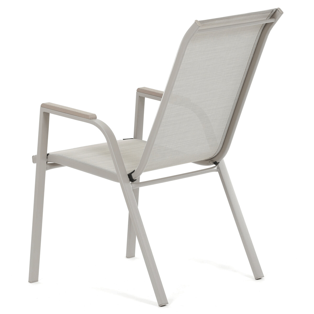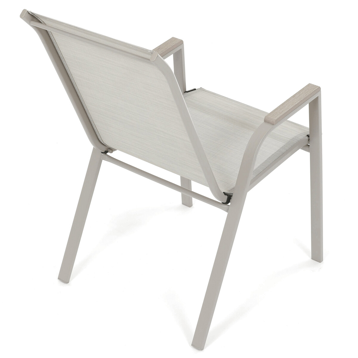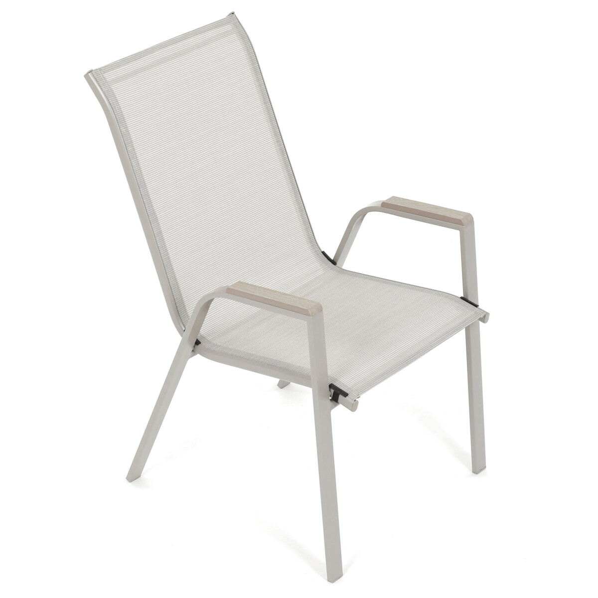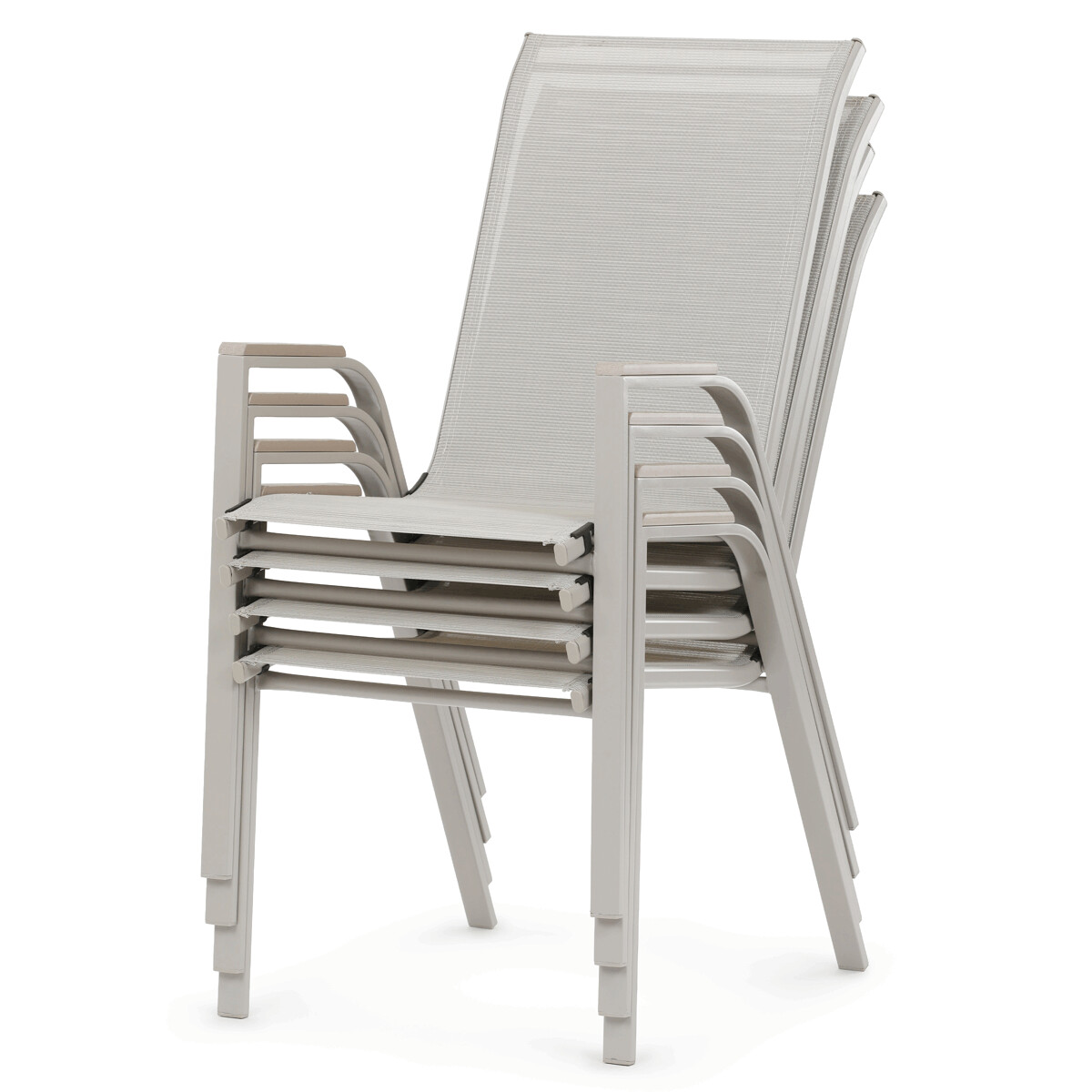 Záhradná stolička v béžovom prevedení kombinuje pevný rám s polywoodovými podrúčkami v dekore duba, ktoré dodávajú prírodný vzhľad a jednoduchú údržbu. Sedák a operadlo sú potiahnuté odolnou sieťovinou, ktorá je príjemná na dotyk a umožňuje pohodlné sedenie aj počas teplých dní vďaka svojej priedušnosti. Konštrukcia stoličky je navrhnutá tak, aby bola stohovateľná, čo uľahčuje jej skladovanie a manipuláciu. Stabilná kovová podnož zaisťuje bezpečné a pevné opretie na rôznych povrchoch. Vďaka kombinácii materiálov a dizajnu je stolička vhodná na vonkajšie použitie na terasách, záhradách či balkónoch.