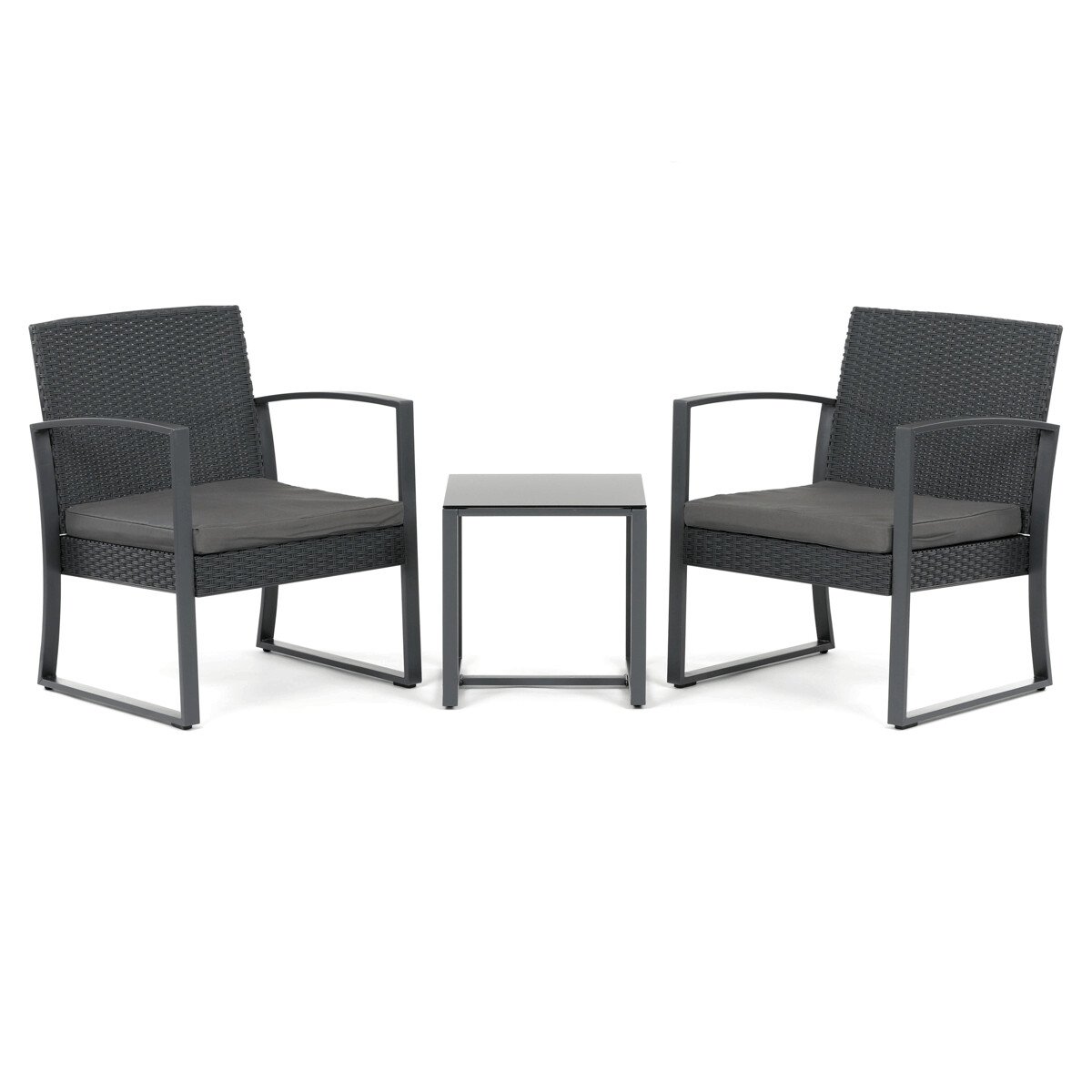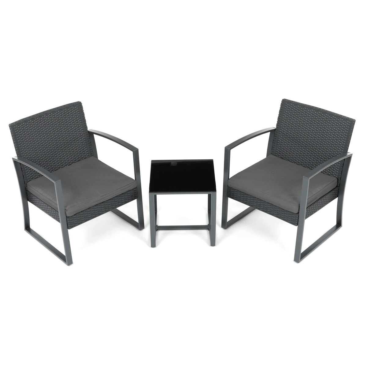 Záhradný set 1+2 v šedom prevedení kombinuje pevnú kovovú konštrukciu s odolným polyratanom, ktorý je vhodný na vonkajšie použitie. Súčasťou sú dve pohodlné kreslá s polstrovanými sedákmi potiahnutými šedou látkou, ktoré zabezpečujú komfortné posedenie. Stolová doska je vyrobená z čierneho tvrdeného skla, ktoré sa ľahko udržiava a dodáva celému setu moderný vzhľad. Stabilný rám z kovu zaručuje dlhú životnosť a bezpečnosť pri používaní. Vďaka kompaktným rozmerom je set ideálny na balkóny, terasy či menšie záhrady.