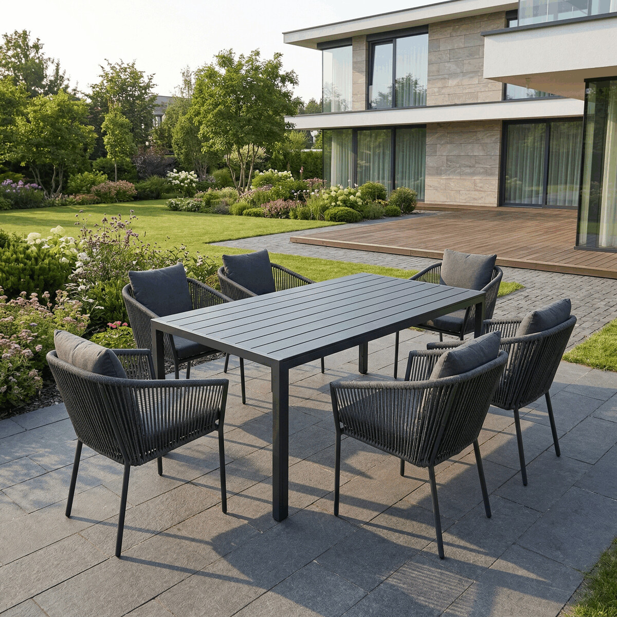 Záhradný stôl s rozmermi 180x90 cm kombinuje pevnú hliníkovú konštrukciu s vysoko odolnou doskou z polywoodu v sivom odtieni. Hliník je ľahký a zároveň stabilný materiál, ktorý zabezpečuje dlhú životnosť a odolnosť voči poveternostným vplyvom. Polywoodová doska napodobňuje vzhľad dreva, pritom je ľahko udržiavateľná a odolná proti vlhkosti, praskaniu či vyblednutiu. Stôl je vhodný na vonkajšie použitie na terasy alebo záhrady, kde poskytuje dostatok priestoru pre pohodlné posedenie. Vďaka kombinácii materiálov ponúka stabilitu, praktickosť a moderný dizajn v neutrálnej sivej farbe.
