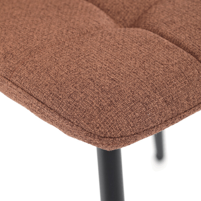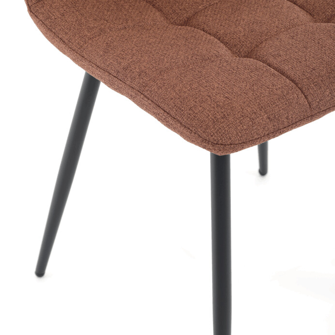 Jedálenská stolička DCL-V2017 BR2 kombinuje pohodlie s praktickým dizajnom vhodným do moderných interiérov. Sedák a operadlo sú potiahnuté hnedou látkou, ktorá sa ľahko udržiava a je doplnená dizajnovým prešívaním pre zvýraznenie estetického dojmu. Čierne matné kovové nohy zabezpečujú stabilitu a pevnosť celej stoličky, zatiaľ čo madlo v hornej časti operadla uľahčuje manipuláciu a prenášanie. Absencia podrúčok umožňuje väčšiu variabilitu usporiadania pri jedálenskom stole. Stolička je navrhnutá tak, aby poskytovala komfortné sedenie s dôrazom na jednoduchú údržbu a dlhú životnosť.