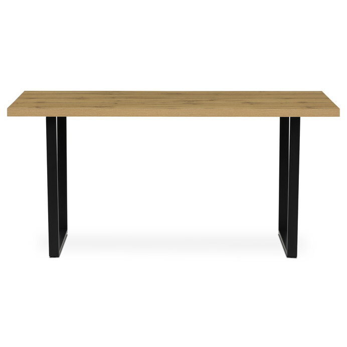 Jedálenský stôl s rozmermi 160x80x76 cm kombinuje dosku z hnedého lamina s dekorom dubu a stabilnú kovovú podnož v čiernom matnom prevedení. Doska je opatrená ABS hranou, ktorá chráni okraje pred poškodením a uľahčuje údržbu, zatiaľ čo matný povrch zabezpečuje príjemný vzhľad bez lesku. Pevná kovová podnož poskytuje vysokú stabilitu a nosnosť, čo umožňuje pohodlné využitie v jedálenských priestoroch. Materiál dosky je navrhnutý pre jednoduchú údržbu a odolnosť voči bežnému opotrebovaniu, čo prispieva k dlhej životnosti stola. Tento model je ideálnou voľbou pre moderné interiéry, kde sa kladie dôraz na funkčnosť a jednoduchý dizajn.