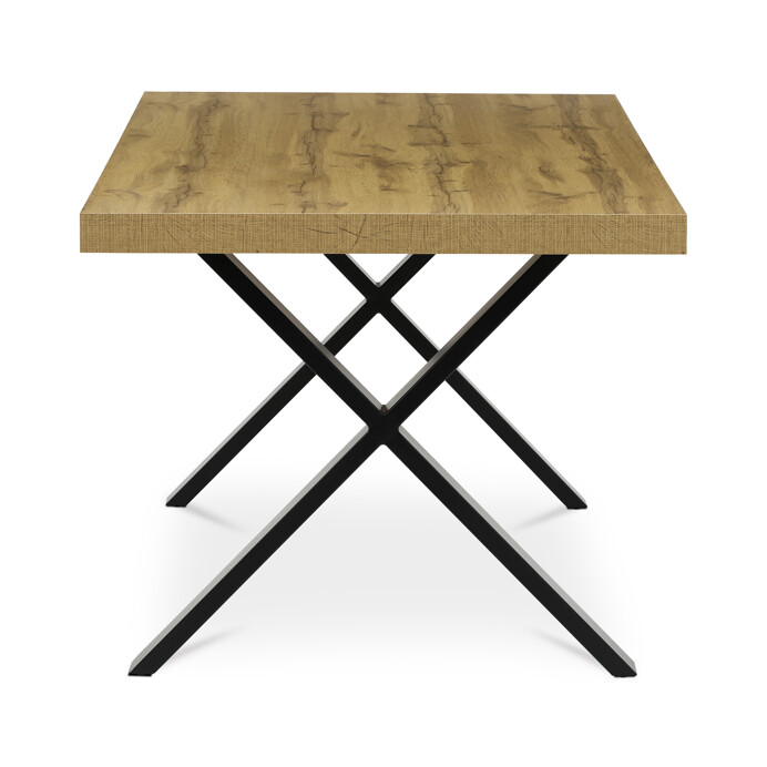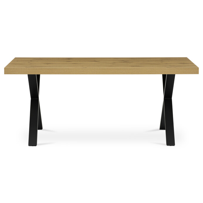 Jedálenský stôl HT-R5316 OAK ponúka priestrannú pracovnú plochu s rozmermi 180x90 cm, ktorá je vyrobená z odolného lamina s matnou povrchovou úpravou v dekore dubu. Doska je opatrená ABS hranou, ktorá chráni okraje pred poškodením a uľahčuje údržbu. Stabilné kovové nohy v tvare X v čiernom prevedení zabezpečujú pevnú oporu a moderný industriálny vzhľad. Stôl je navrhnutý bez rozkladacej funkcie, čo podčiarkuje jeho jednoduchosť a robustnosť. Výška 76 cm zodpovedá štandardným ergonomickým parametrom pre pohodlné sedenie pri jedálenskom stole.