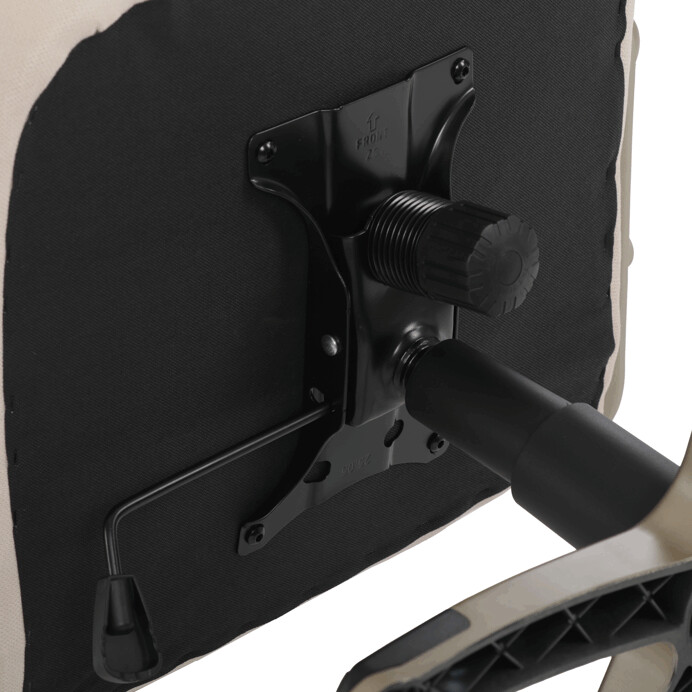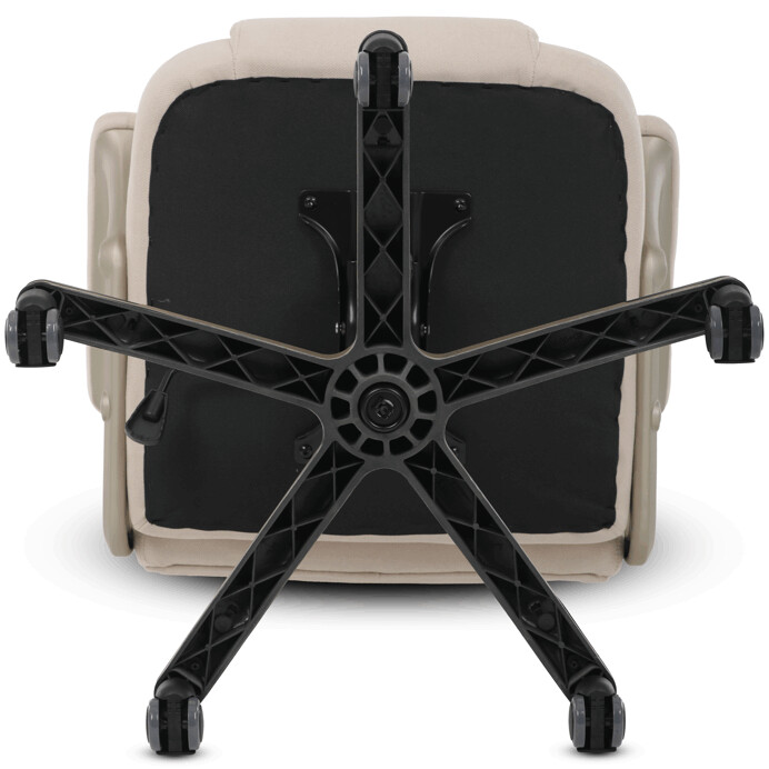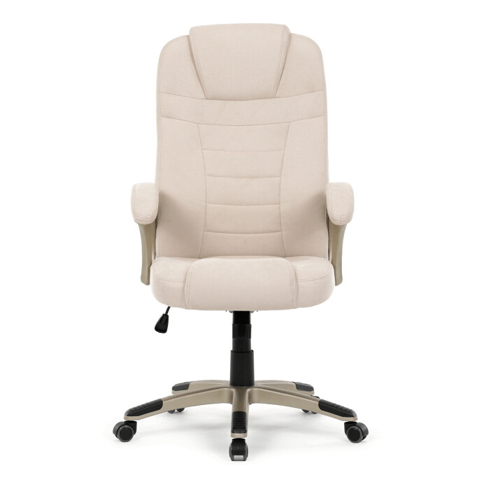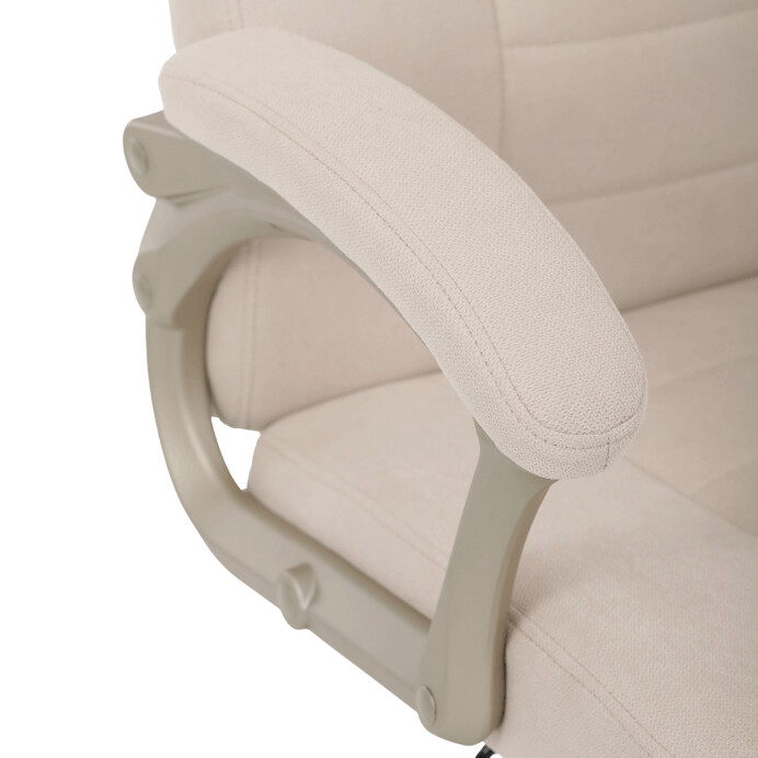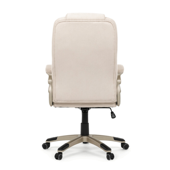Kancelárske kreslo v béžovom prevedení kombinuje komfort s praktickým dizajnom vhodným na dlhodobé sedenie. Čalúnenie z kvalitnej látky zabezpečuje príjemný povrch a jednoduchú údržbu, zatiaľ čo pevné podrúčky s mäkkým polstrovaním podporujú pohodlie paží. Vysoké operadlo je doplnené pevnou opierkou hlavy s zmäkčenou vrchnou časťou, ktorá prispieva k lepšej podpore krčnej chrbtice. Hojdací mechanizmus umožňuje nastavenie polohy sedáku a výškovo nastaviteľná funkcia zabezpečuje ergonomické prispôsobenie používateľovi. Stabilná základňa z plastu v odtieni champagne je vybavená kolieskami vhodnými na tvrdé povrchy, čo uľahčuje mobilitu a zároveň chráni podlahu.