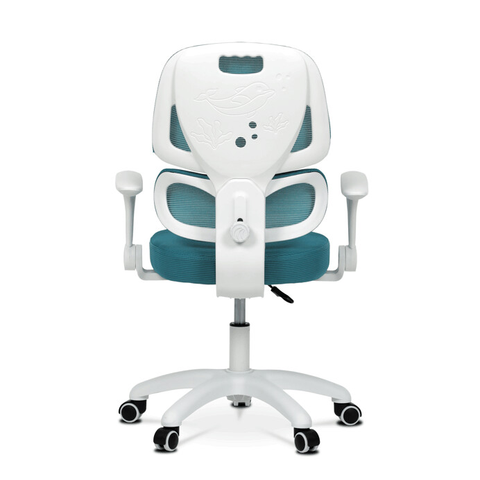 Detská stolička s modrou sieťovinou ponúka pohodlné a vzdušné sedenie vďaka priedušnému materiálu, ktorý podporuje cirkuláciu vzduchu. Operadlo je vybavené výškovo nastaviteľnou bedrovou opierkou, ktorá zabezpečuje správnu podporu spodnej časti chrbta, a výškovo nastaviteľným operadlom pre individuálne prispôsobenie. Odklápacie podrúčky umožňujú jednoduchší prístup k pracovnému priestoru a zároveň šetria miesto. Plastový biely kríž zaručuje stabilitu a ľahkosť celej stoličky, zatiaľ čo kolieska sú vhodné na tvrdé podlahy, čo uľahčuje pohyb po miestnosti. Výškovo nastaviteľný sedák umožňuje optimálne prispôsobenie výšky sedenia podľa potreby dieťaťa.