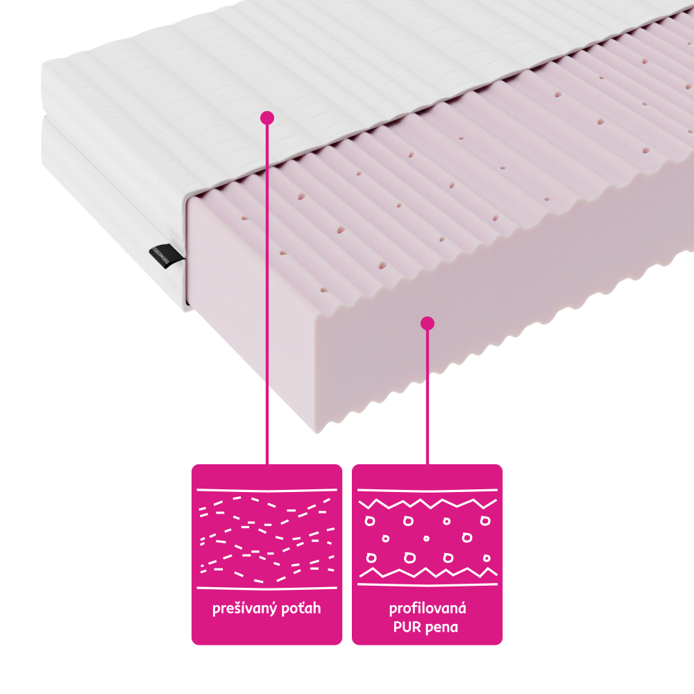 Farba peny a prešívanie poťahu matraca sa môžu mierne líšiť od vyobrazenia. Tieto vizuálne rozdiely nemajú žiadny vplyv na funkčné vlastnosti, komfort ani kvalitu matraca. Matrac je vákuovo balený a rolovaný, preto ho po jeho rozbalení odporúčame nechať na rovnom podklade 24-48 hodín v pokoji (nepoužívať a nezaťažovať), aby zregeneroval na deklarovanú výšku.