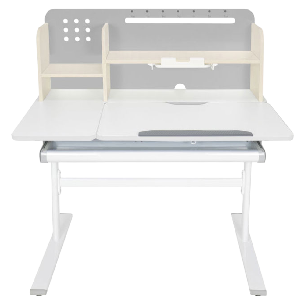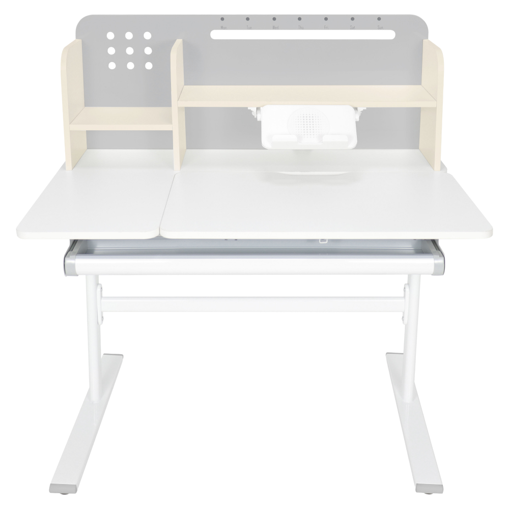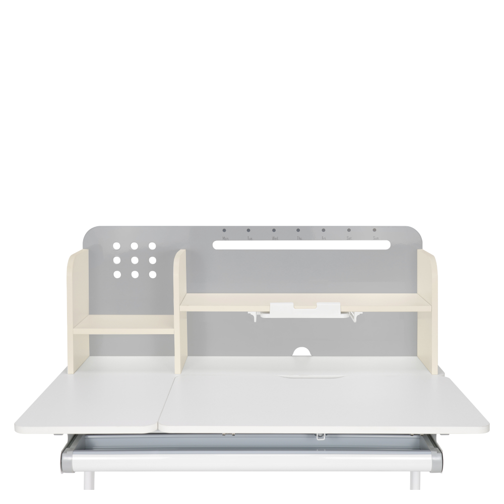 Zadný panel obsahuje police, držiak na knihy a otvor na vedenie káblov