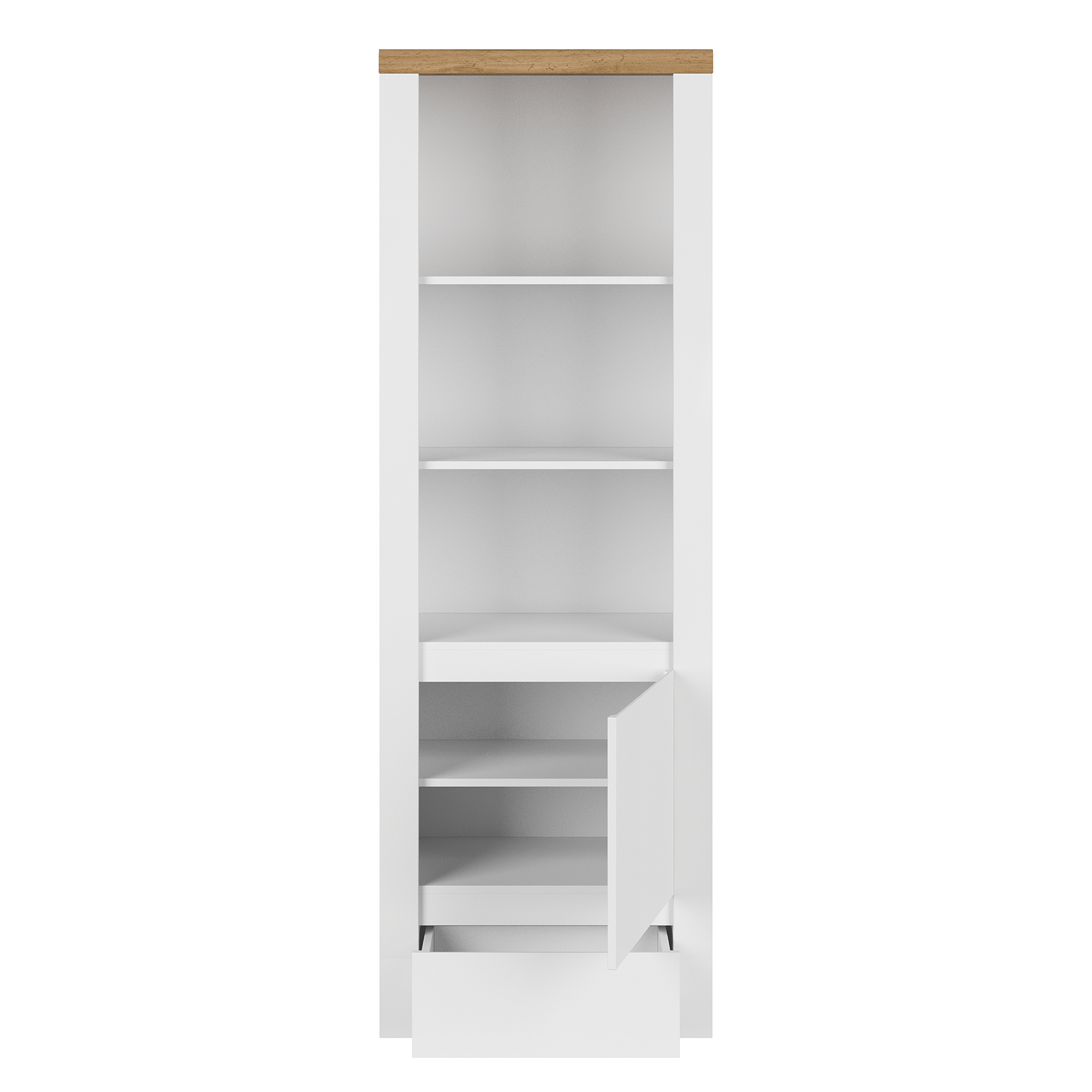 Obsahuje otvorené police, otváraciu skrinku a zásuvku