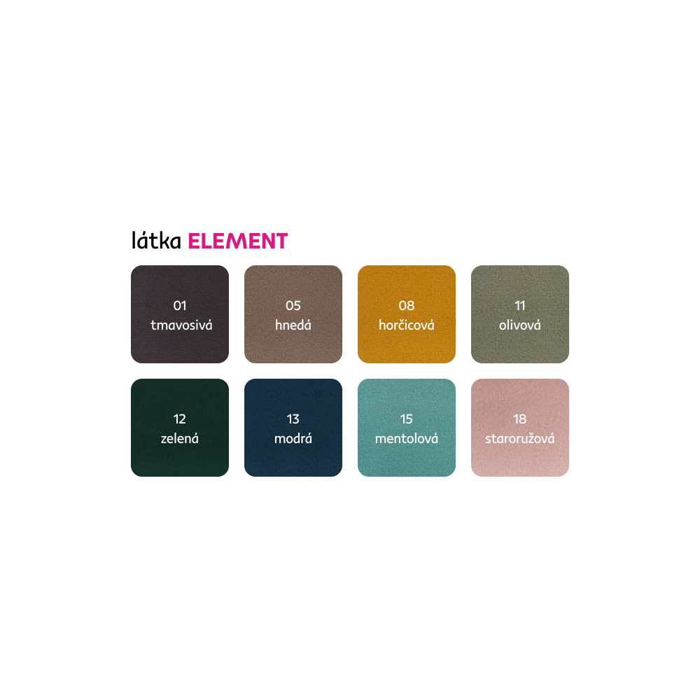 Možnosť objednania v 8 farebných odtieňoch látky Element v cene 1239 Eur s dodacou lehotou 6-8 týždňov. Pri individuálnej objednávke je potrebné zaplatiť 20% zálohu z danej sumy. Po uhradení zálohy bude Vaša požiadavka zadaná do výroby.