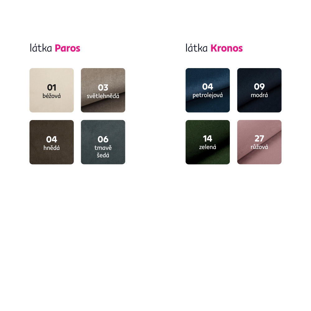 Možnosť objednania v 4 farebných odtieňoch látky Paros a v 4 farebných odtieňoch látky Kronos s dodacou lehotou 6-8 týždňov. Pri individuálnej objednávke je potrebné zaplatiť 20% zálohu z danej sumy. Po uhradení zálohy bude Vaša požiadavka zadaná do výroby.