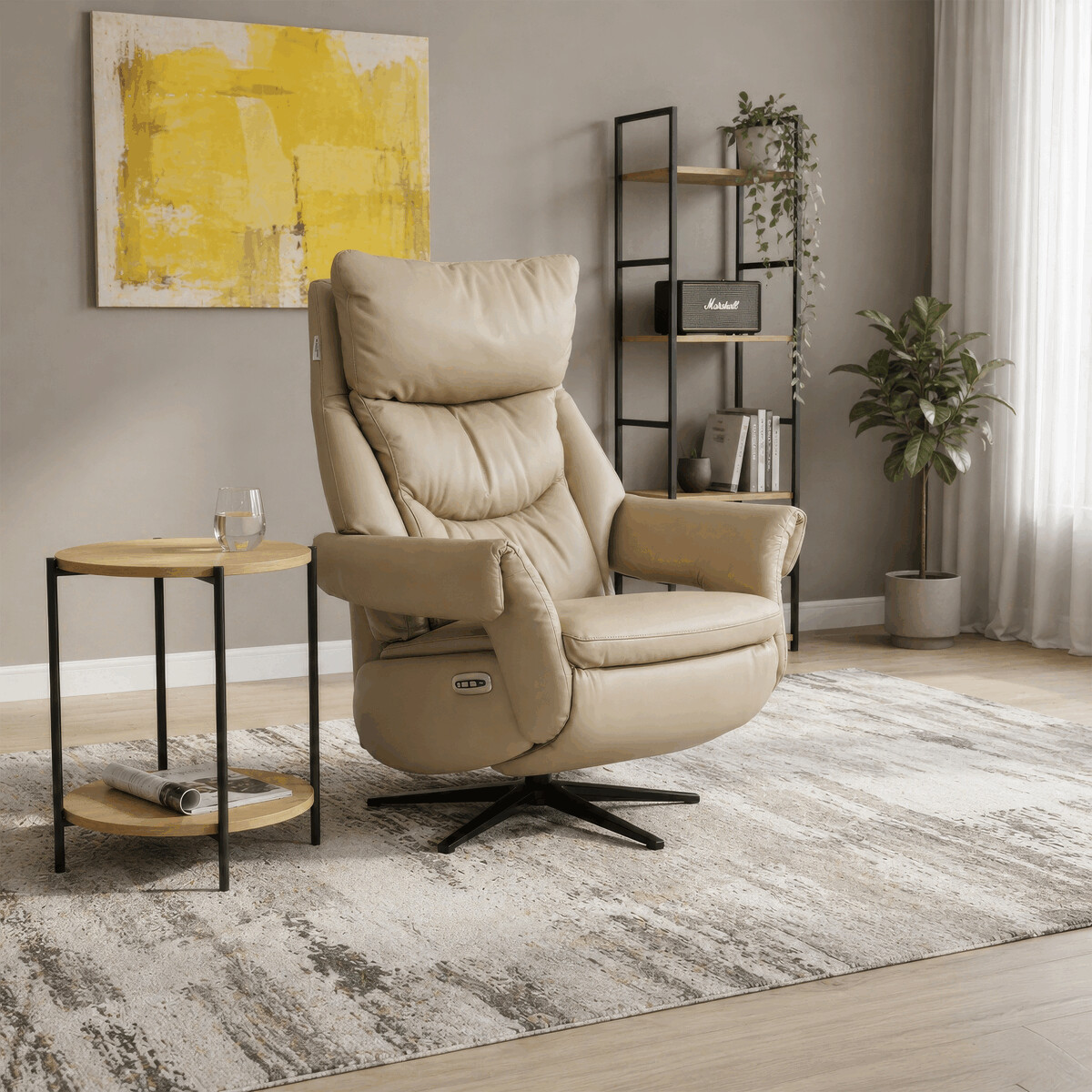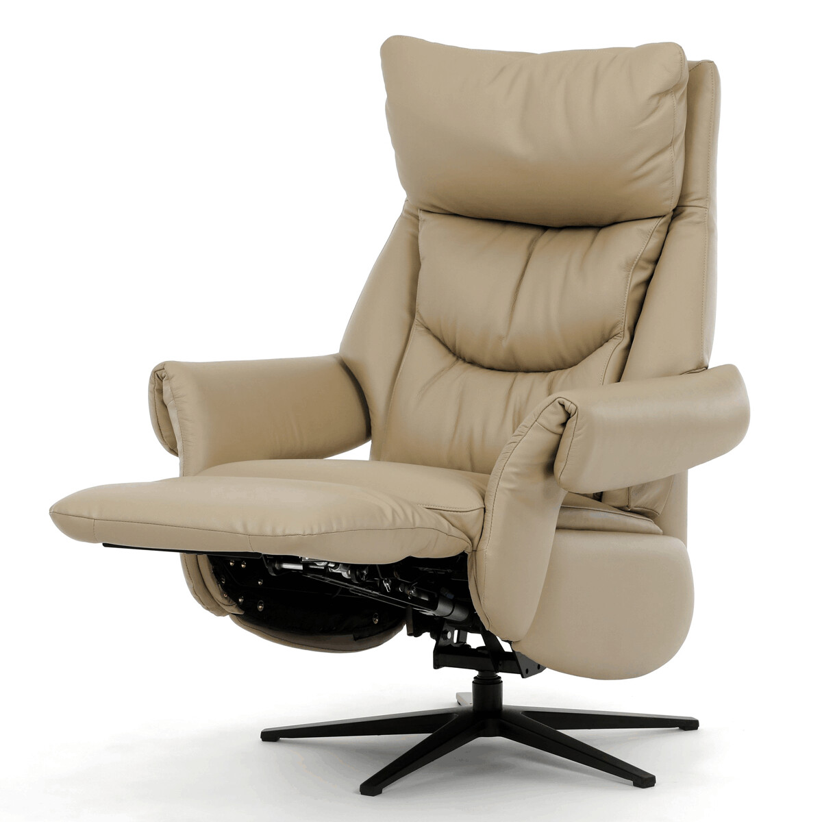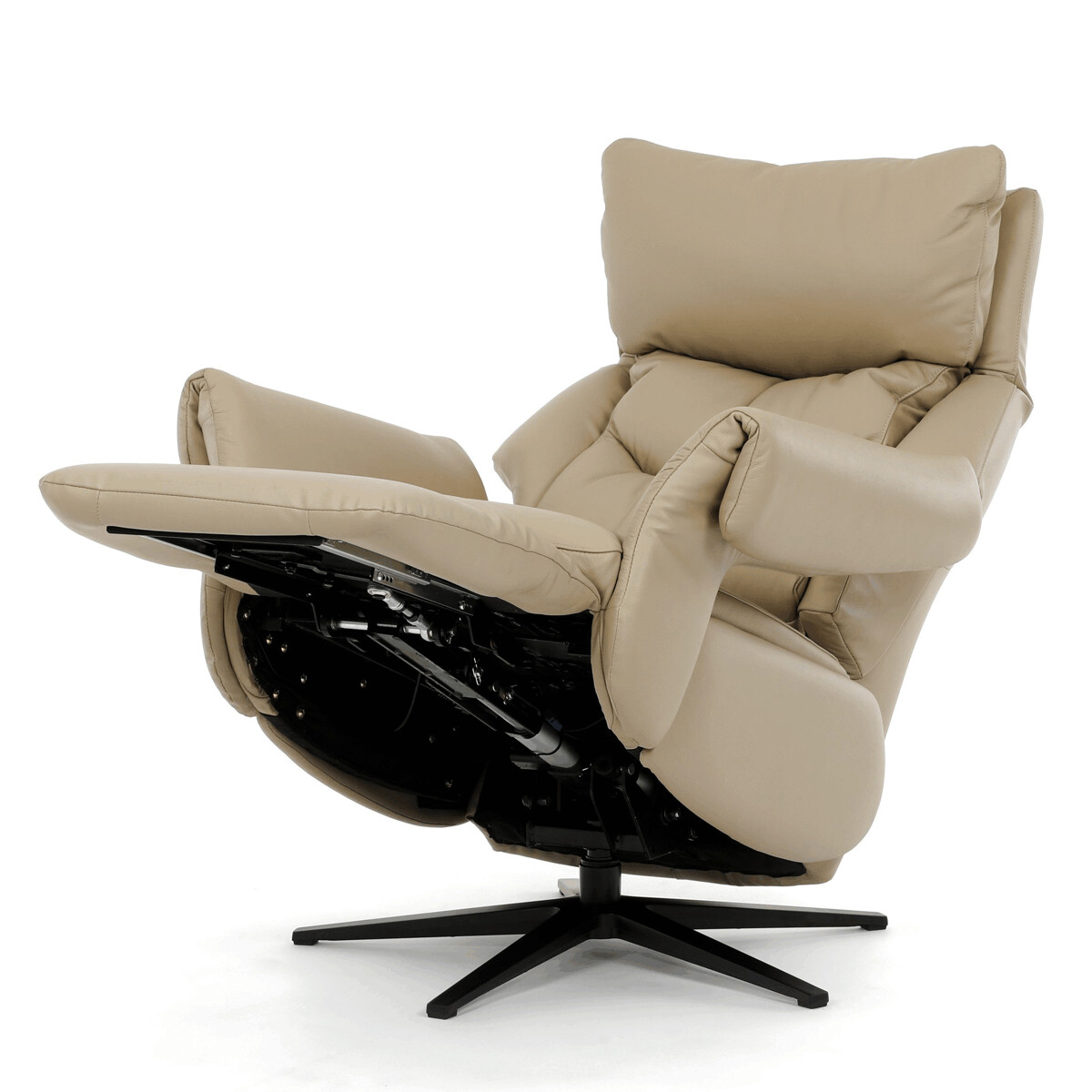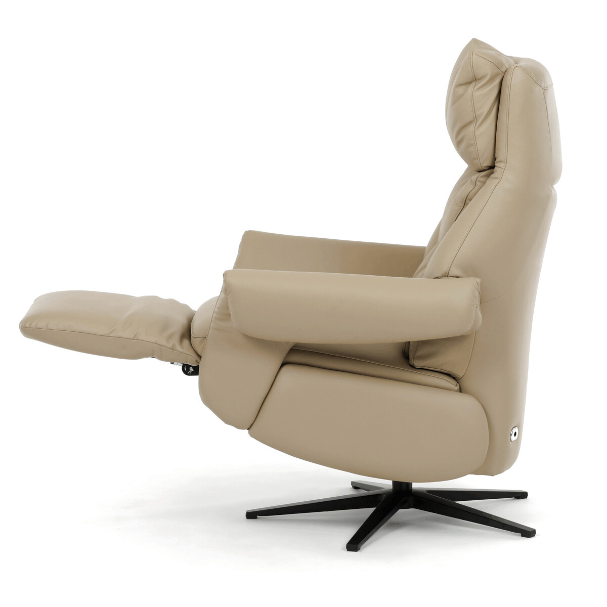 Polohovacie kreslo s elektrickým ovládaním a dvoma motormi ponúka komfortnú relaxáciu s možnosťou individuálneho nastavenia operadla a podnožky. Poťah je vyrobený z kombinácie pravej kože a béžovej ekokože, ktorá je príjemná na dotyk a ľahko sa udržiava. Pevná kovová podnož zabezpečuje stabilitu a zároveň umožňuje plynulý 360° otočný pohyb. Široké čalúnené podrúčky dopĺňajú ergonomický tvar sedáka a operadla, ktoré poskytujú dostatočnú oporu pre chrbát aj hlavu. Elektrické ovládanie s dotykovými plochami umožňuje jednoduché a presné nastavenie polohy kresla podľa individuálnych potrieb.