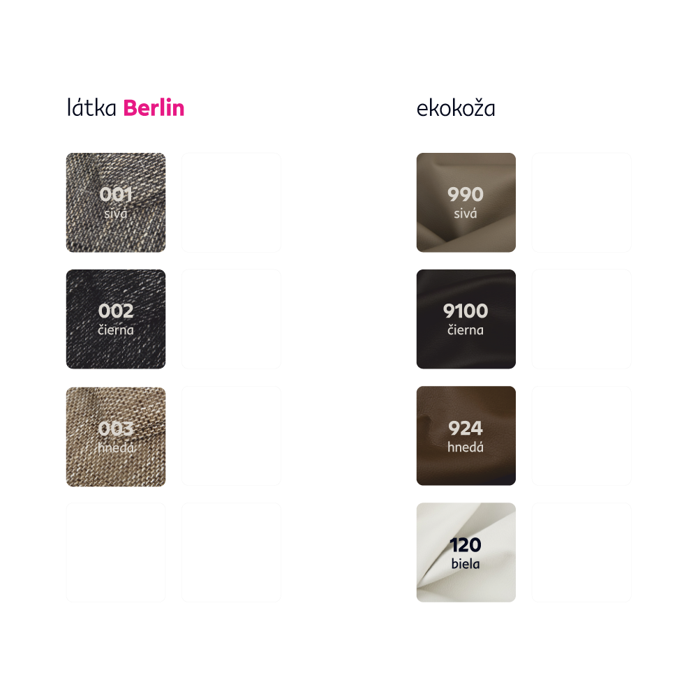 Možnosť individuálnych objednávok sedacej súpravy v 4 farebných prevedeniach ekokože v kombinácii s 3 farebnými prevedeniami látky Berlin v cene 1359 Eur. Pri individuálnej objednávke je potrebné zaplatiť 20% zálohu z danej sumy. Po uhradení zálohy bude Vaša požiadavka zadaná do výroby. Dodacia lehota 6-8 týždňov.