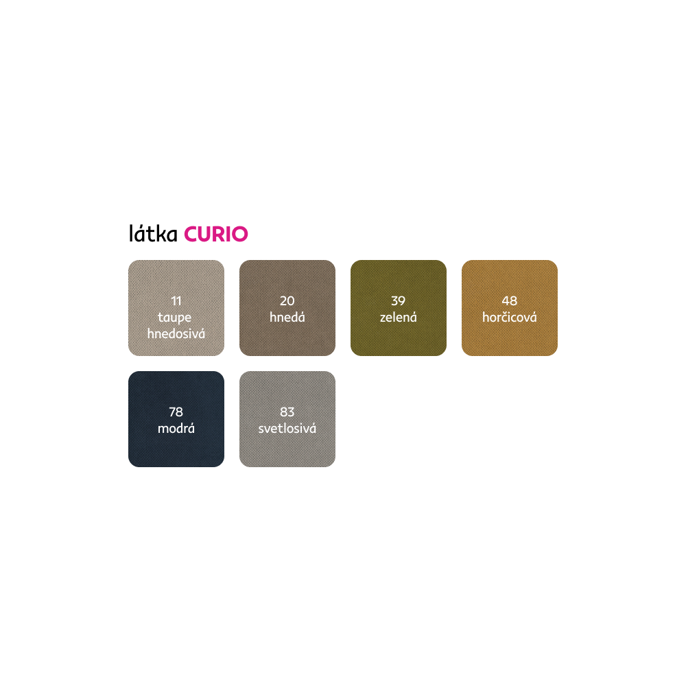 Ponúkame vám možnosť vybrať si zo 6 farebných prevedení látky Curio za cenu 999 Eur. Pri individuálnej objednávke je potrebné zaplatiť 20% zálohu z danej sumy. Po uhradení zálohy bude Vaša požiadavka zadaná do výroby. Dodacia lehota 6-8 týždňov.
