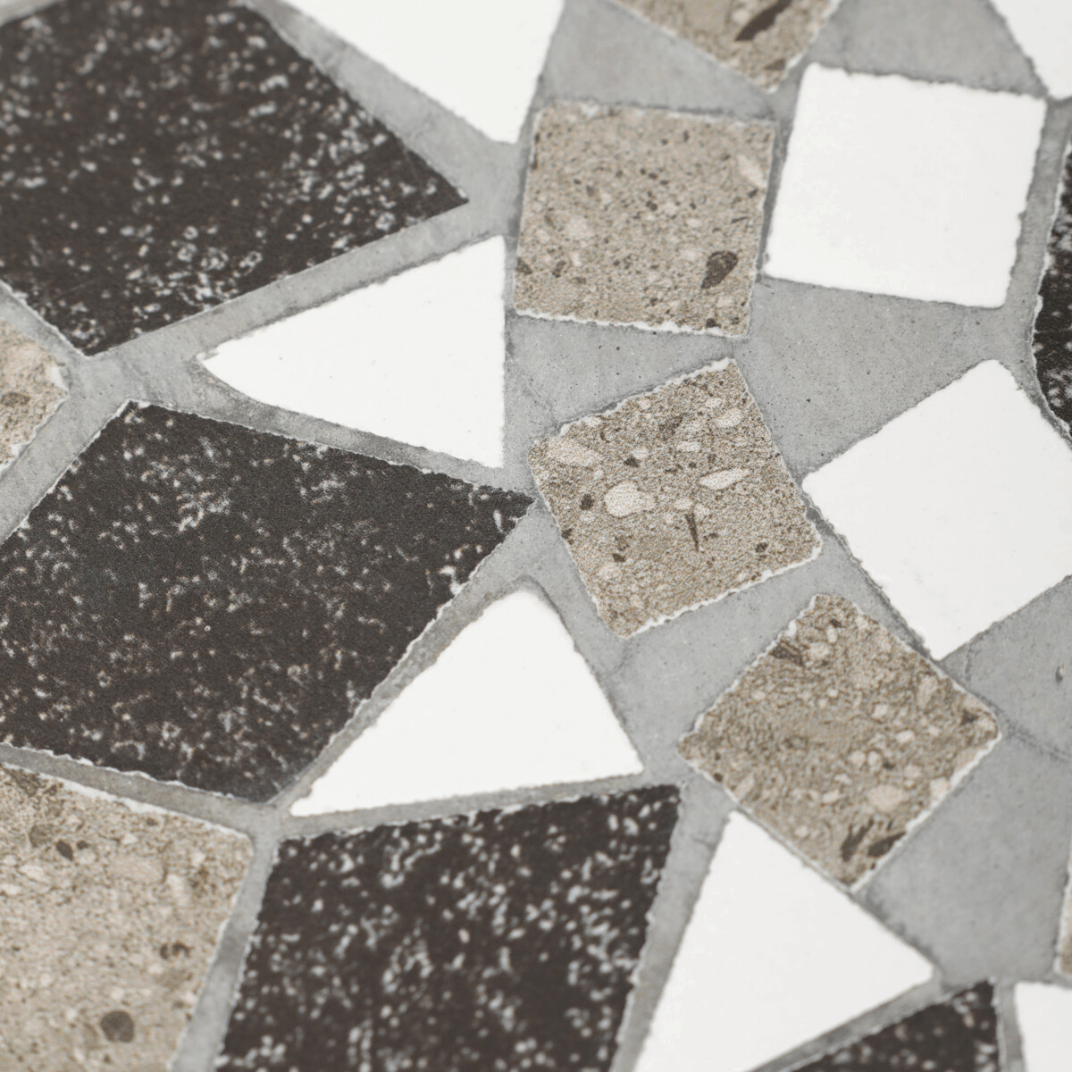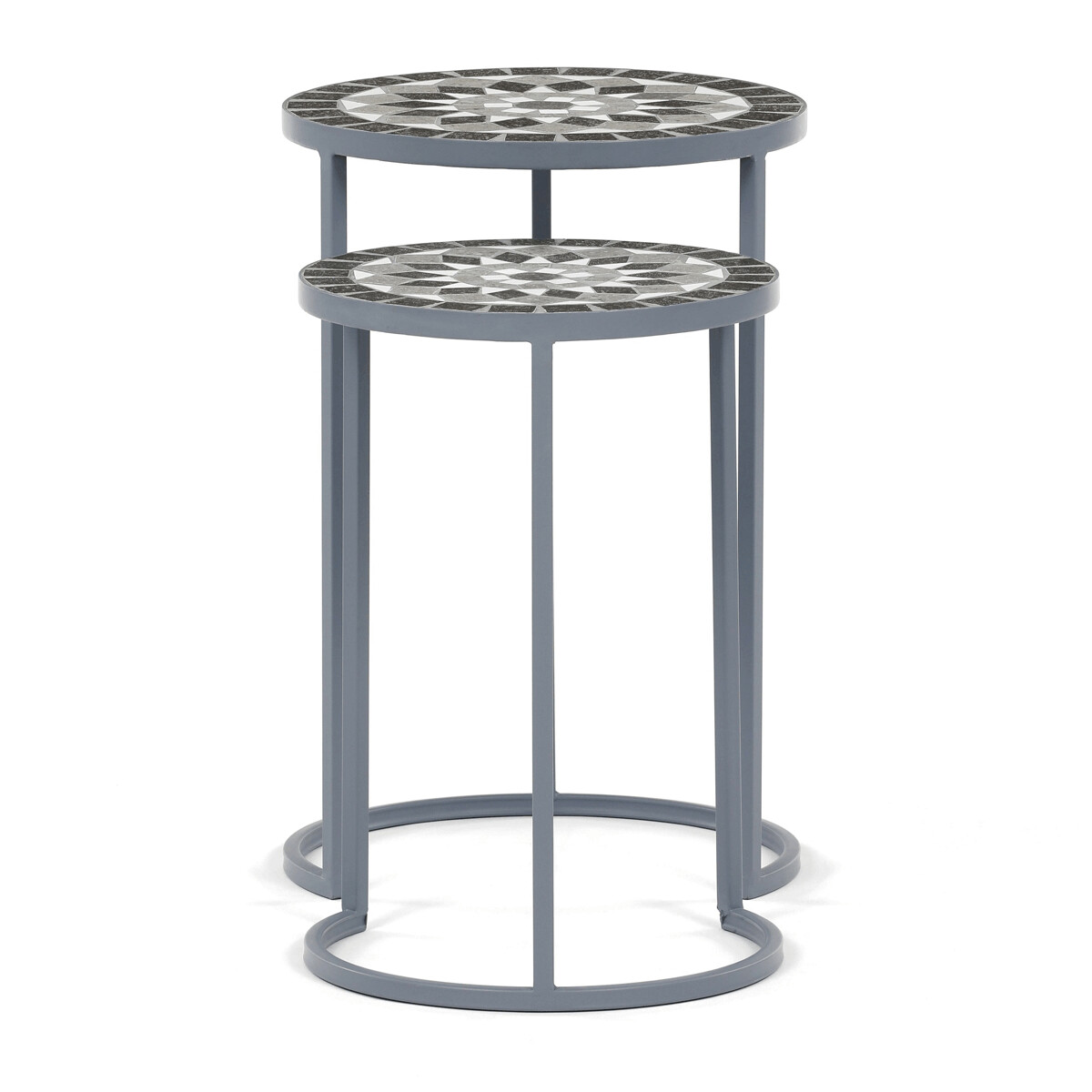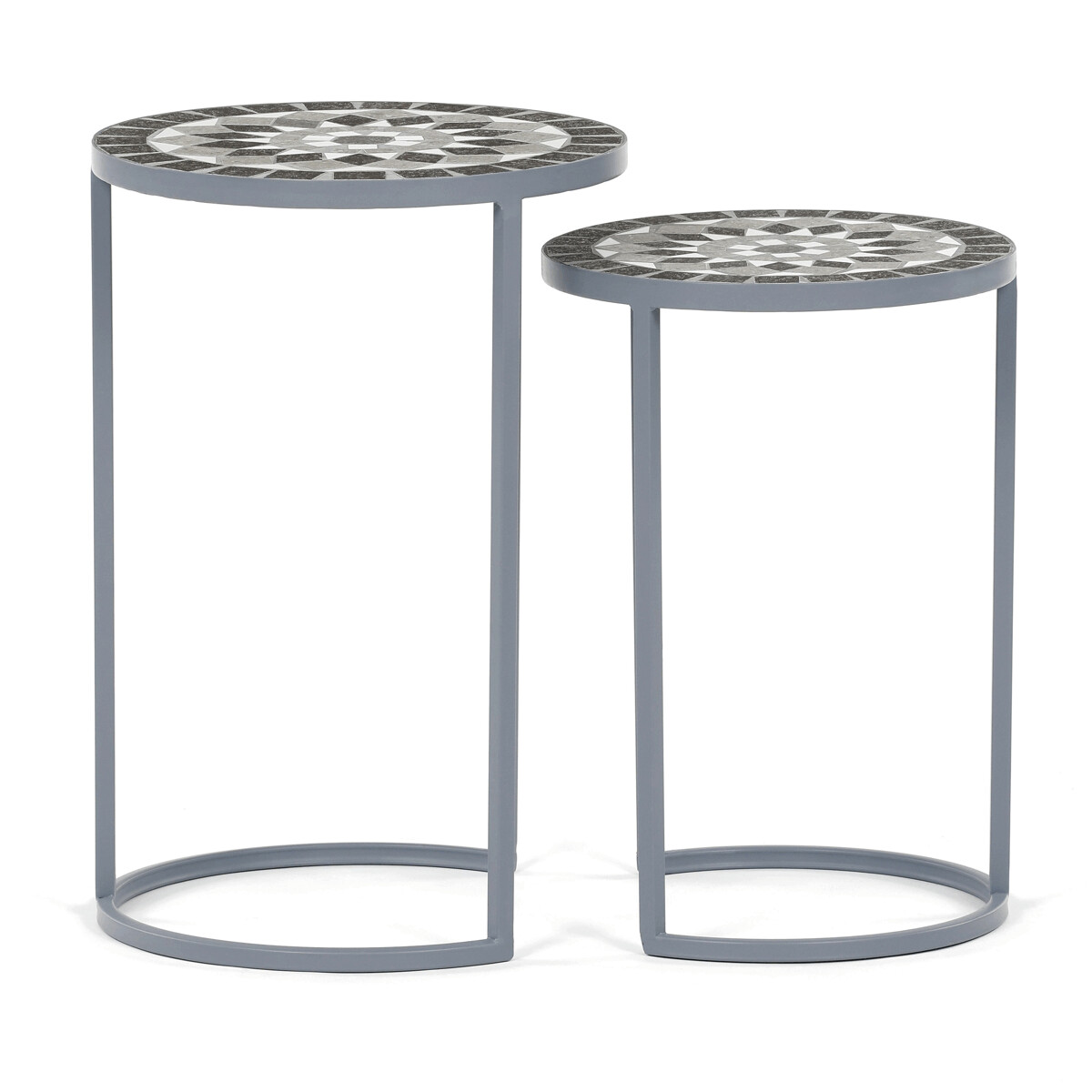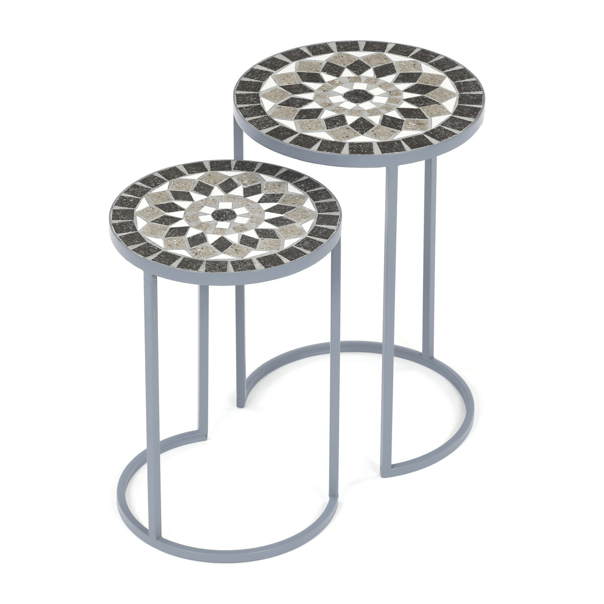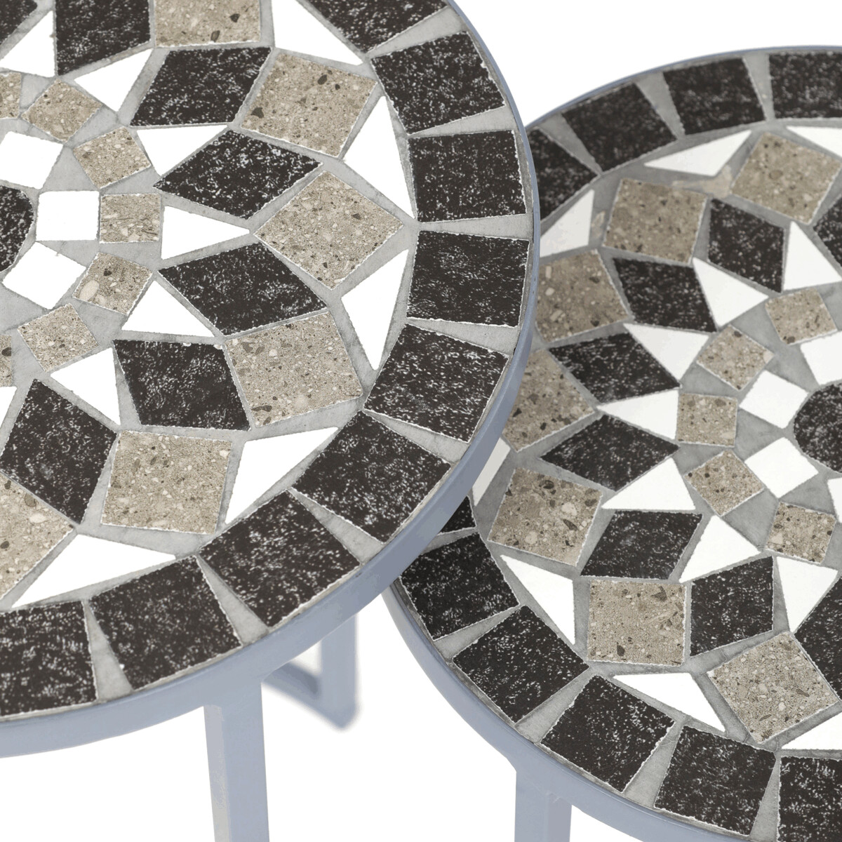 Sada dvoch stojanov na kvety v sivom prevedení kombinuje pevnú kovovú konštrukciu s dekoratívnou keramickou doskou s mozaikovým vzorom. Okrúhle dosky zdobí geometrický motív v prírodných odtieňoch sivej a bielej, ktorý dodáva stojanom výrazný vizuálny efekt. Kovová podnož je navrhnutá tak, aby zabezpečila stabilitu a zároveň pôsobila vzdušne vďaka otvorenému tvaru s oblúkovým spodným rámom. Stojany sú vhodné na umiestnenie kvetín alebo dekoratívnych predmetov v interiéri aj na kryté vonkajšie priestory. Vďaka rôznym veľkostiam je možné stojany kombinovať a vytvoriť tak zaujímavú kompozíciu.