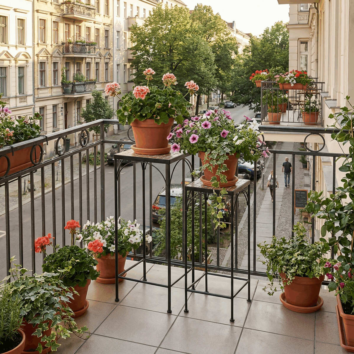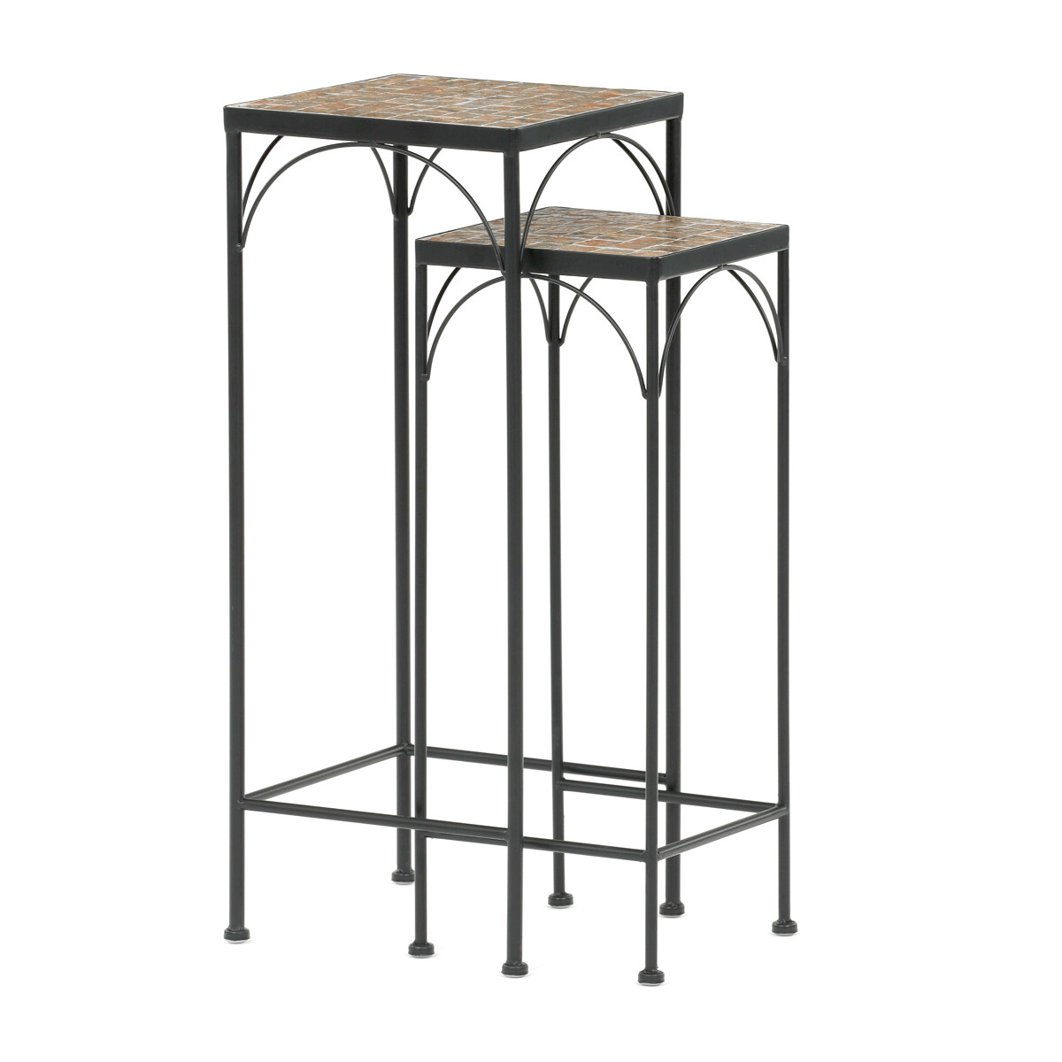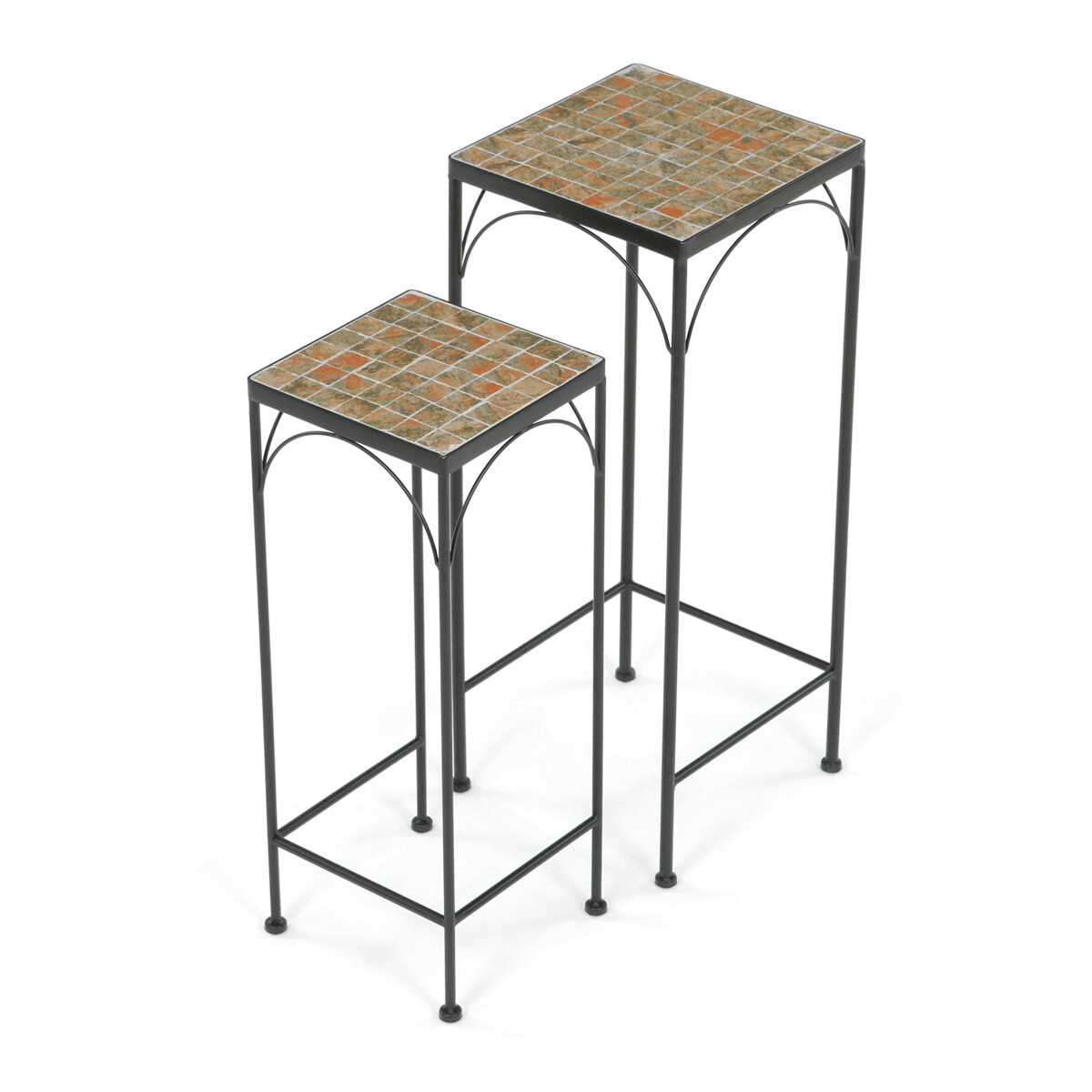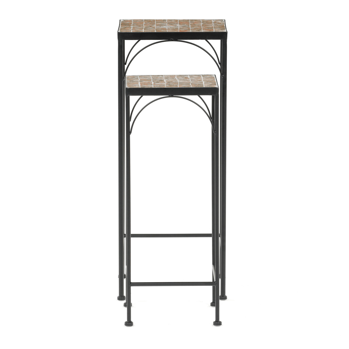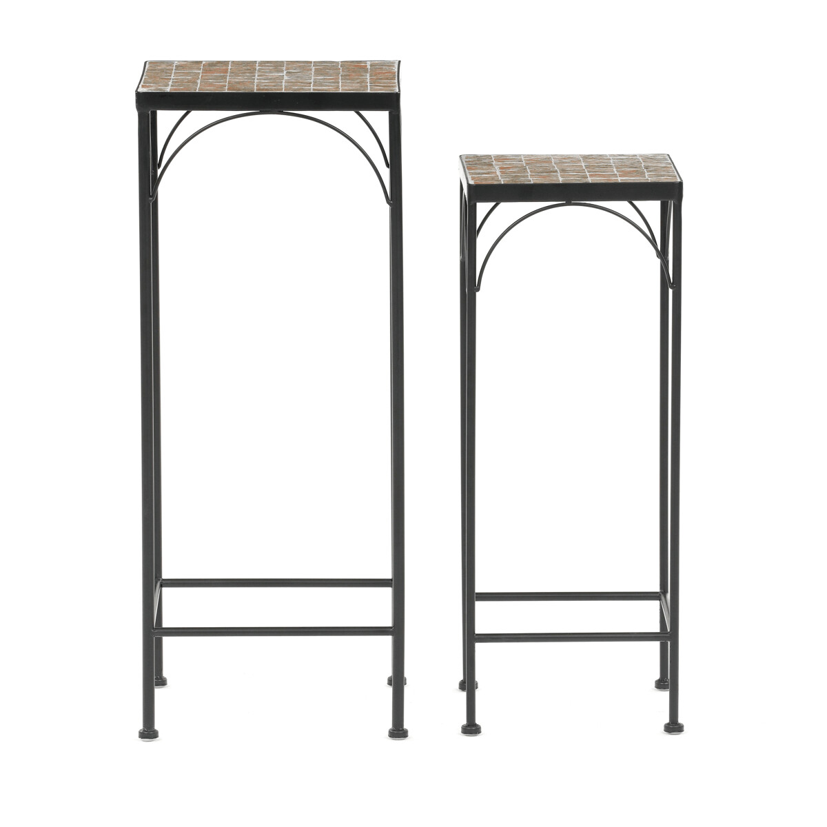 Sada dvoch stojanov na kvety s kovovou konštrukciou a doskou z keramickej mozaiky v prírodných odtieňoch prináša do interiéru aj exteriéru praktický a dekoratívny prvok. Kovové nohy sú tenké, ale pevné, s decentnými oblúkovými výstuhami pod doskou, ktoré zvyšujú stabilitu a vizuálnu ľahkosť. Mozaiková doska je zložená z drobných keramických dlaždíc, ktoré vytvárajú zaujímavý farebný vzor a ľahko sa udržiavajú. Vyšší a nižší stojan umožňujú variabilné usporiadanie kvetín alebo dekorácií, čím sa hodia do rôznych priestorových riešení. Vďaka kombinácii kovu a keramiky je sada navrhnutá pre dlhú životnosť a jednoduchú údržbu.