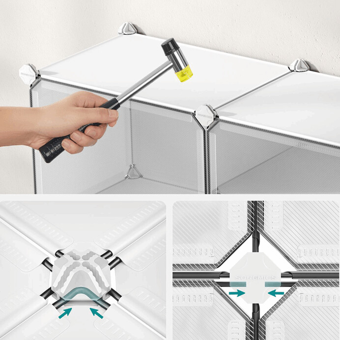 Modulárny plastový botník v bielej farbe ponúka šesť samostatných priehradiek s dvierkami, ktoré umožňujú prehľadné a praktické uskladnenie obuvi. Každá priehradka je vybavená priehľadnými dvierkami s otváraním smerom nahor, čo uľahčuje prístup a zároveň chráni obsah pred prachom. Vďaka modulárnemu prevedeniu je botník možné jednoducho zostaviť a prispôsobiť priestoru podľa potreby. Plastový materiál sa ľahko udržiava a zabezpečuje ľahkosť celého systému. Súčasťou balenia je aj gumová palička pre jednoduchú montáž.