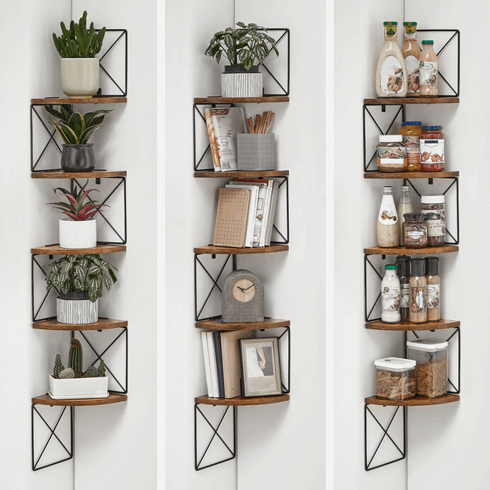 Nástenná rohová polica v dekore old wood kombinuje teplé hnedé odtiene MDF dosiek s čiernym kovovým rámom, ktorý zabezpečuje stabilné upevnenie a zaujímavý industriálny vzhľad. Polica pozostáva z piatich segmentov v tvare štvrťkruhu, ktoré sú navzájom prepojené kovovými prvkami s krížovým vzorom, čo prispieva k pevnosti a zároveň vytvára vzdušný dizajn. Rozmery 127,5 × 20 cm umožňujú efektívne využitie rohových priestorov na vystavenie dekorácií či drobných predmetov. Povrch MDF dosiek je upravený tak, aby pripomínal štruktúru starého dreva, čo dodáva polici rustikálny charakter. Vďaka kombinácii materiálov a konštrukčnému riešeniu je polica vhodná do moderných aj vintage interiérov.