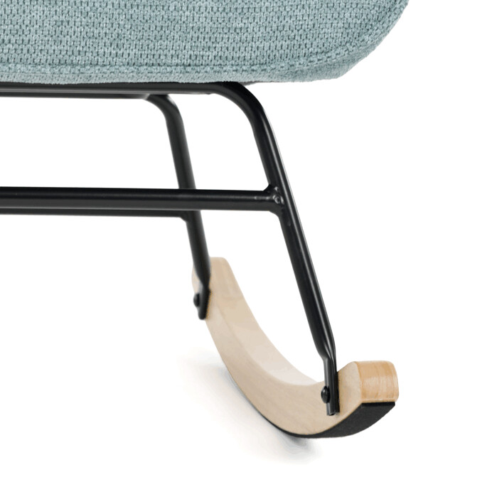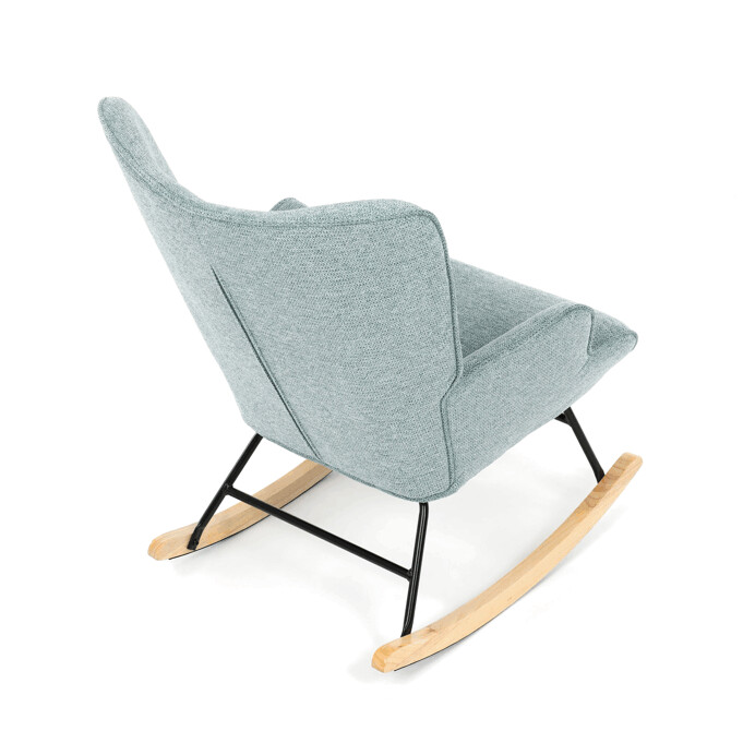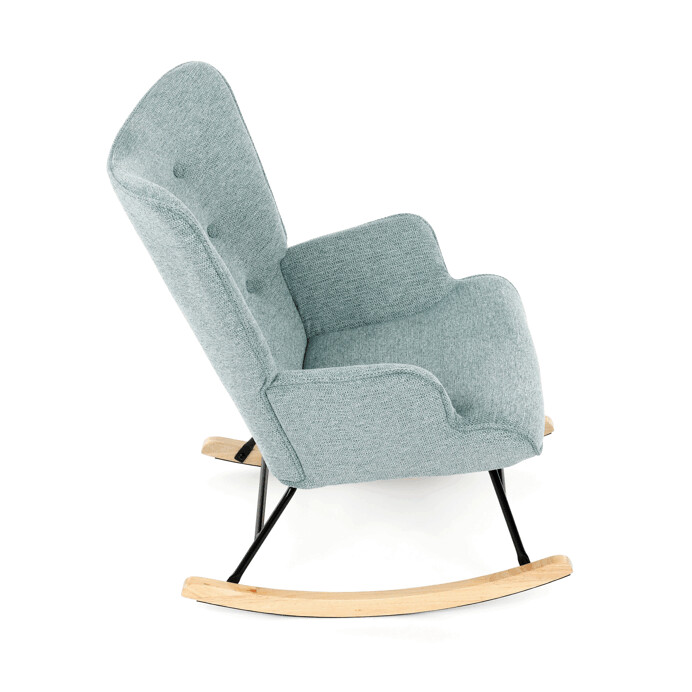 Hojdacie kreslo v modrom prevedení je potiahnuté prémiovou látkou, ktorá ponúka príjemný dotyk a jednoduchú údržbu. Sedák a operadlo sú ergonomicky tvarované pre pohodlné sedenie, doplnené o pevné čalúnené podrúčky. Stabilné nohy sú vyrobené z masívneho kaučukovníka a doplnené o čierny kovový rám, ktorý zabezpečuje pevnosť a dlhú životnosť. Hojdací mechanizmus umožňuje plynulé hojdanie, ktoré prispieva k relaxácii a oddychu. Kreslo je určené do interiérov s dôrazom na komfort a štýl, jeho rozmery a nosnosť zodpovedajú bežným štandardom pre hojdacie kreslá.
