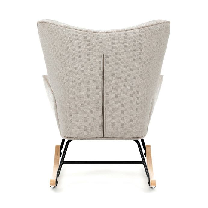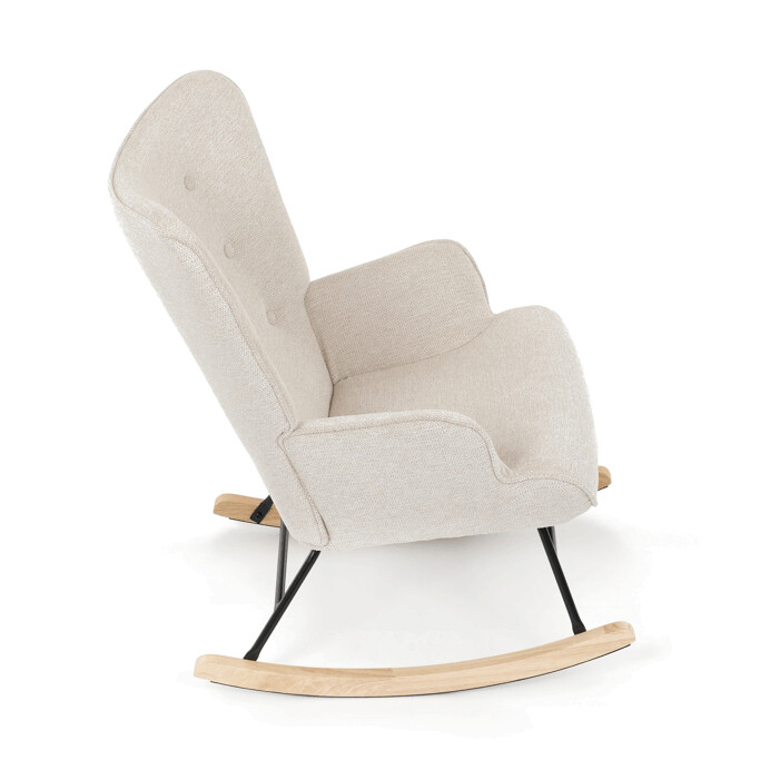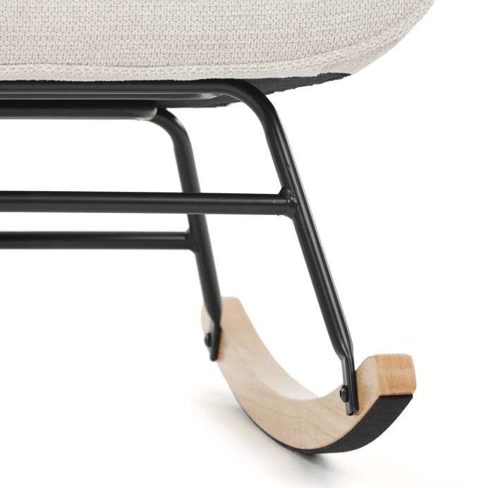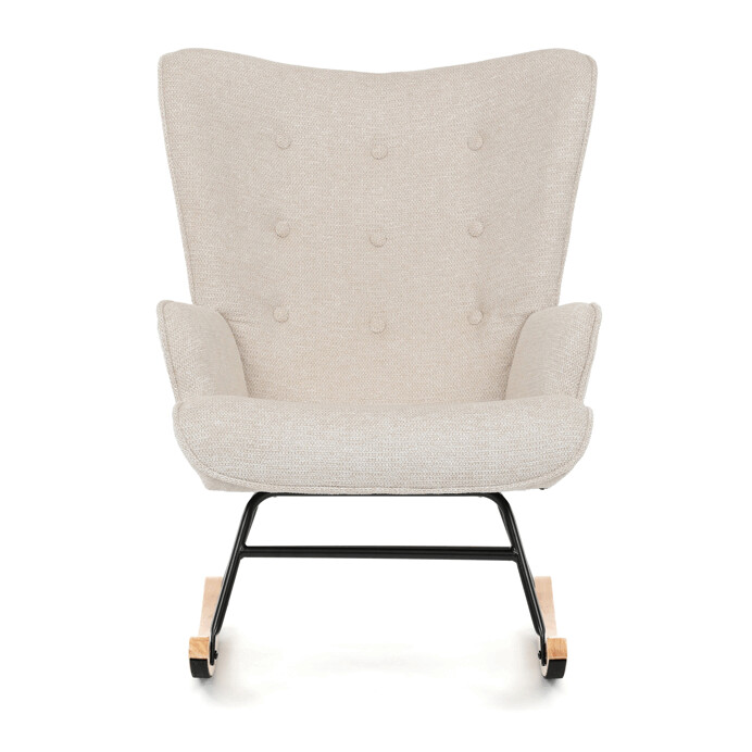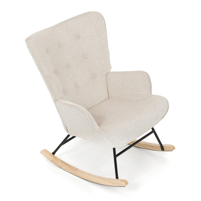 Hojdacie kreslo s béžovým čalúnením z prémiovej látky ponúka pohodlné posedenie s jemnou textúrou, ktorá je príjemná na dotyk a ľahko sa udržiava. Sedák a operadlo sú ergonomicky tvarované a doplnené o pevné podrúčky pre maximálny komfort. Stabilné nohy sú vyrobené z kombinácie čierneho kovu a masívneho kaučukovníka, čo zabezpečuje pevnosť a dlhú životnosť. Hojdací mechanizmus umožňuje plynulé a tiché hojdanie, ktoré prispieva k relaxácii. Kreslo je vhodné do moderných aj klasických interiérov, jeho rozmery a nosnosť zodpovedajú bežným štandardom pre pohodlné sedenie.