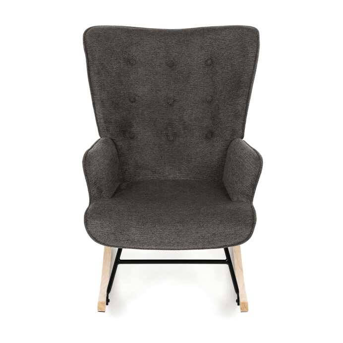 Hojdacie kreslo v sivej farbe je potiahnuté prémiovou látkou, ktorá ponúka príjemný povrch a jednoduchú údržbu. Sedák a operadlo sú ergonomicky tvarované s decentným prešitím, ktoré dodáva kreslu elegantný vzhľad. Pevné nohy sú vyrobené z kombinácie čierneho kovu a masívneho kaučukovníka, čo zabezpečuje stabilitu a dlhú životnosť. Kreslo je vybavené hojdacím mechanizmom, ktorý umožňuje príjemné a plynulé hojdanie pre relaxáciu. Podrúčky sú pevné a čalúnené rovnakou látkou ako sedák, čo zvyšuje komfort pri sedení.