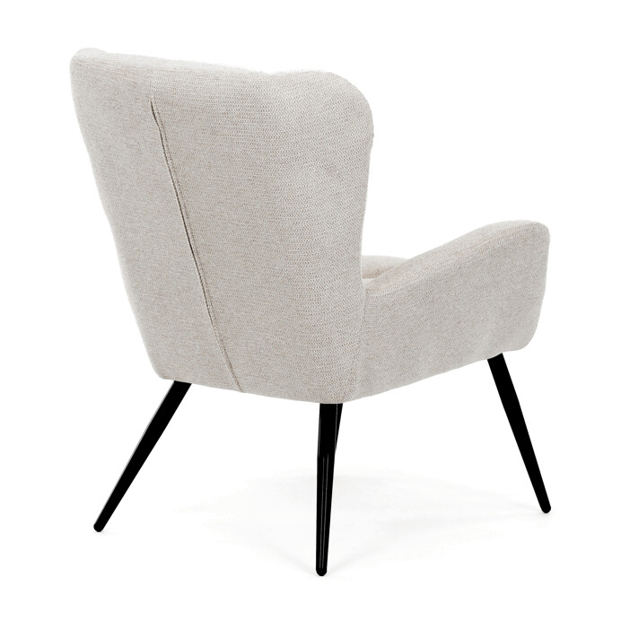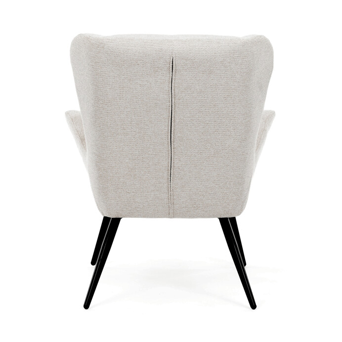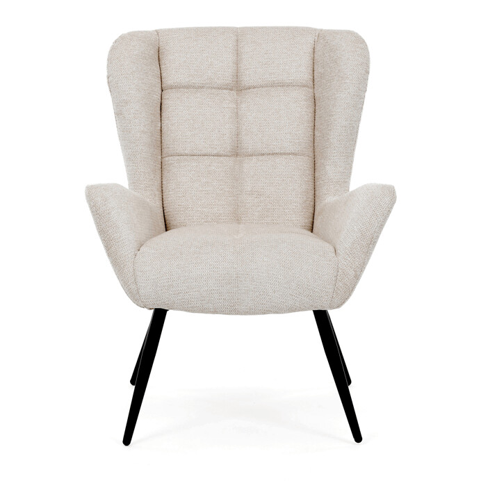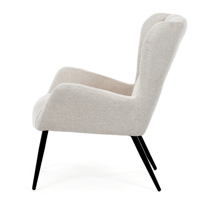 Kreslo ušiak v krémovom odtieni ponúka pohodlie vďaka vysokému polstrovaniu sedáka aj operadla, ktoré je potiahnuté prémiovou látkou s príjemnou textúrou. Pevné čierne kovové nohy zabezpečujú stabilitu a dlhú životnosť, zatiaľ čo integrované podrúčky prispievajú k ergonomickému posedeniu. Dizajn s charakteristickými vysokými bočnými opierkami poskytuje oporu hlavy a ramenám, čo zvyšuje komfort pri oddychu. Kreslo je vhodné do moderných aj klasických interiérov, kde vynikne svojím nadčasovým tvarom a neutrálne farebným prevedením.