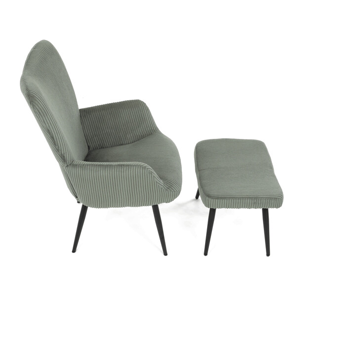Relaxačné kreslo s podnožkou v zelenej manšestri ponúka pohodlné sedenie s mäkkým, príjemným poťahom, ktorý zvýrazňuje štruktúru manšestru. Pevné čierne kovové nohy zabezpečujú stabilitu a dlhú životnosť, zatiaľ čo integrované podrúčky prispievajú k pohodliu pri oddychu. Kreslo nie je otočné ani rozkladacie, no vďaka pridanému taburetu umožňuje pohodlné oprenie nôh a relaxáciu. Dizajn kombinuje klasický tvar s moderným materiálom, čo ho robí vhodným doplnkom do obývacích izieb aj relaxačných zón. Celková konštrukcia je navrhnutá tak, aby poskytovala komfortné sedenie s dôrazom na pevnosť a stabilitu.