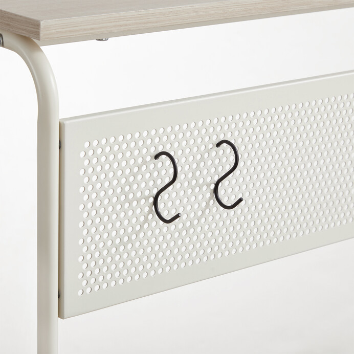 Odkladací stolík s rozmermi 55 × 32 × 65,8 cm kombinuje dosku a spodnú poličku z MDF s dekorom bieleného dubu a pevnú kovovú konštrukciu v bielej farbe. Matný povrch dosky uľahčuje údržbu a odoláva bežnému opotrebovaniu. Kovová konštrukcia je doplnená o štyri kolieska, ktoré umožňujú jednoduchú mobilitu stolíka a jeho flexibilné umiestnenie v priestore. Praktický odkladací priestor na spodnej poličke ponúka ďalšie miesto na uloženie drobných predmetov alebo dekorácií. Kompaktné rozmery a stabilné prevedenie zabezpečujú univerzálne využitie v domácnostiach aj kanceláriách.