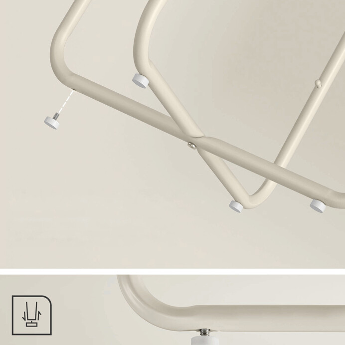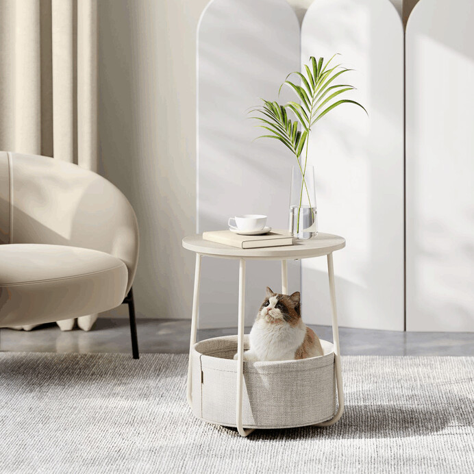 Odkladací stolík s okrúhlou doskou o priemere 45 cm a výške 50 cm ponúka praktický doplnok do obývacej izby či spálne. Doska je vyrobená z MDF s kašmírovým dekorom v béžovom odtieni, ktorý pôsobí jemne a neutrálne. Pod doskou sa nachádza textilný kôš v krémovej farbe, ktorý poskytuje priestor na uloženie drobných predmetov a pomáha udržať poriadok. Kovové nohy v béžovom prevedení zabezpečujú stabilitu a pevnosť stolíka. Celkový dizajn kombinuje funkčnosť s nenápadným moderným štýlom vhodným do rôznych interiérov.