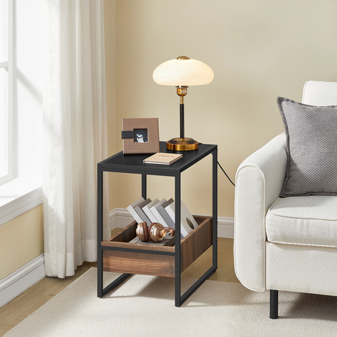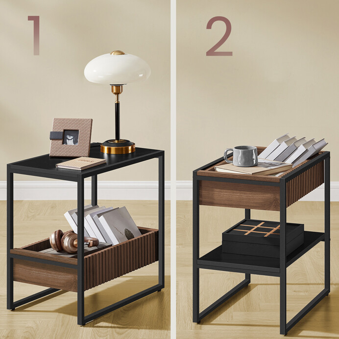 Odkladací stolík s rozmermi 55x35x56 cm kombinuje pevnú kovovú konštrukciu v čiernej matnej úprave s praktickou odkladacou plochou z MDF dosky v rovnakom odtieni. Súčasťou je úložný priestor s prírodnou drevenou zásuvkou v dekore orech, ktorá ponúka dostatok miesta na uloženie drobných predmetov. Rektifikačné nožičky umožňujú vyrovnanie stolíka na nerovnom povrchu, čím zabezpečujú stabilitu a bezpečné používanie. Minimalistický dizajn s kontrastom čiernej a prírodného dreva sa hodí do moderných aj industriálne ladených interiérov.