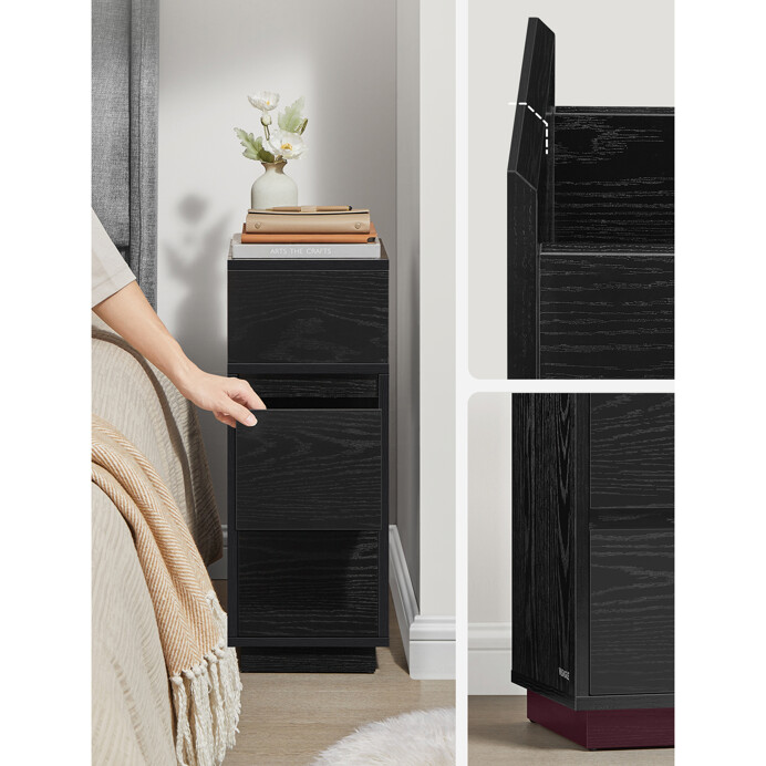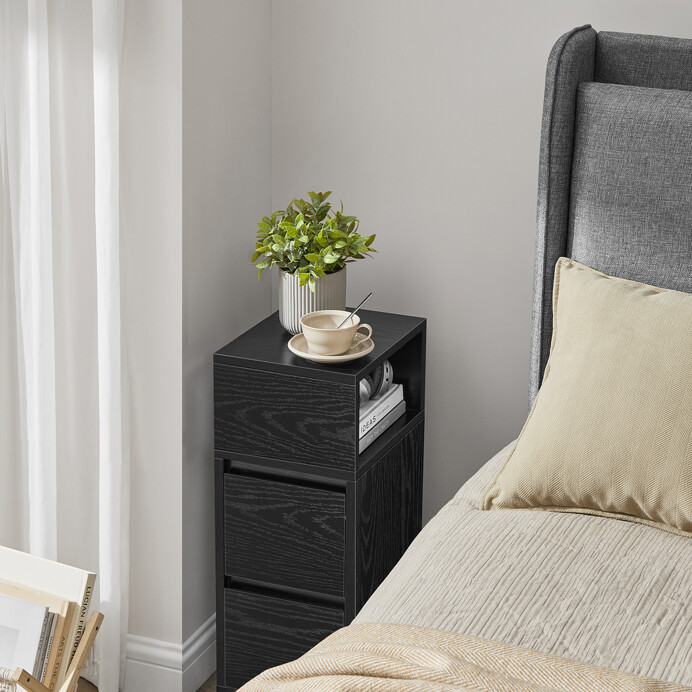 Nočný stolík v čiernom prevedení kombinuje pevnú MDF dosku s praktickým úložným priestorom, ktorý zahŕňa otvorenú priehradku a dve zásuvky. Kompaktné rozmery 25 × 30 × 65 cm umožňujú jednoduché umiestnenie vedľa postele aj v menších miestnostiach. Povrchová úprava s výraznou štruktúrou dreva dodáva stolíku moderný vzhľad a zároveň uľahčuje údržbu. Stabilná základňa zabezpečuje bezpečné postavenie a odolnosť pri každodennom používaní. Tento stolík je vhodný na uloženie kníh, drobných predmetov aj nočných potrieb.