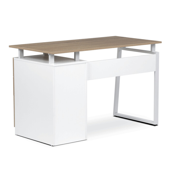 Pracovný stôl so zásuvkami v dekore dub sonoma kombinuje praktický úložný priestor s moderným dizajnom vhodným do kancelárií aj domácich pracovných kútov. Doska stola je vyrobená z melamínu s matnou povrchovou úpravou, ktorá zabezpečuje odolnosť proti poškriabaniu a jednoduchú údržbu. Pevné kovové nohy v bielej farbe poskytujú stabilnú oporu a dodávajú celku industriálny nádych. Tri priestranné zásuvky s kovovými úchytkami umožňujú efektívnu organizáciu pracovných potrieb. Rozmery 120x60x75 cm ponúkajú dostatok priestoru na prácu aj uloženie dokumentov.