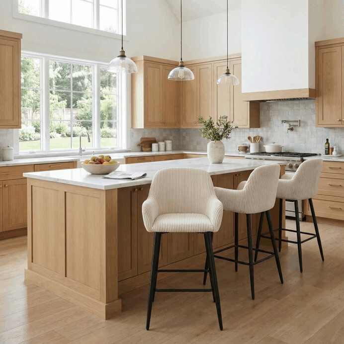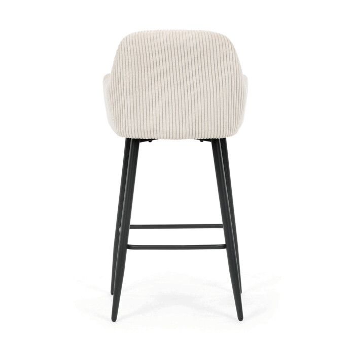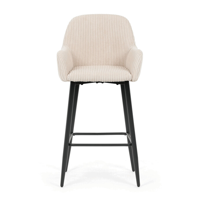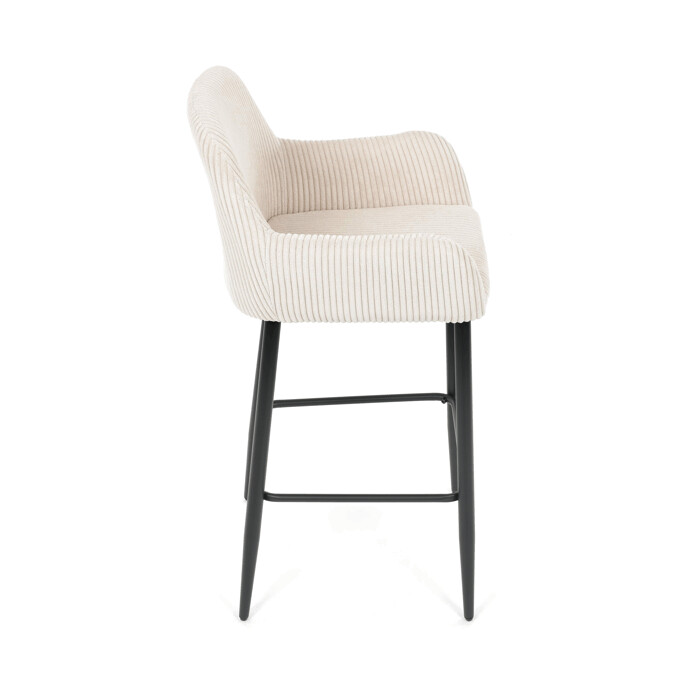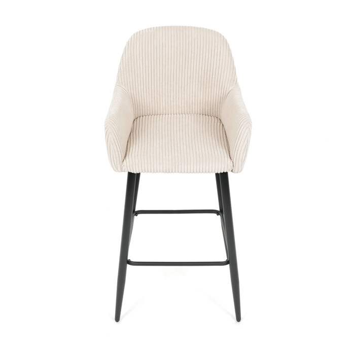 Barová stolička s podrúčkami v béžovom manšestrovom poťahu spája pohodlie a moderný dizajn. Sedák aj operadlo sú čalúnené príjemnou manšestrovou látkou, ktorá ponúka mäkký povrch s jemnou textúrou a jednoduchú údržbu. Pevné kovové nohy v čiernom matnom prevedení zabezpečujú stabilitu a dlhú životnosť, pričom spodná priečna výstuž slúži zároveň ako praktická opierka nôh. Stolička nie je otočná, čo podčiarkuje jej jednoduchý a elegantný tvar vhodný do barov, kuchynských ostrovčekov či vysokých stolov. Vďaka ergonomicky tvarovaným podrúčkam poskytuje dostatočnú oporu pre ruky a prispieva k pohodlnému sedení.