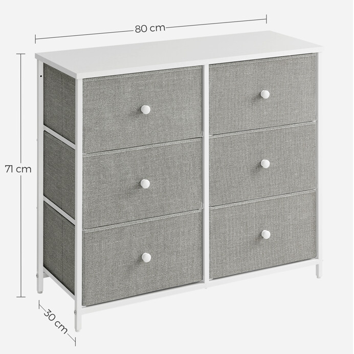 Komoda so sivými látkovými zásuvkami ponúka praktické riešenie úložného priestoru v modernom prevedení. Jej pevná konštrukcia kombinuje biely oceľový rám s odolnou doskou z MDF, ktorá zabezpečuje stabilitu a dlhú životnosť. Šesť zásuviek z netkanej textílie poskytuje ľahký prístup k uloženým veciam a zároveň prispieva k vzdušnému vzhľadu komody. Komoda je vhodná do rôznych interiérov, kde oceníte kombináciu funkčnosti a jednoduchého dizajnu. Rozmery 80x30x71 cm umožňujú umiestnenie aj do menších priestorov.