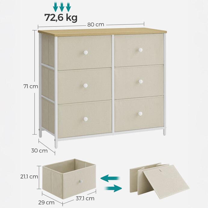 Komoda s rozmermi 80x30x71 cm kombinuje pevnú MDF dosku s dubovým dekorom a matnou povrchovou úpravou s robustným kovovým rámom a nohami v bielej farbe. Šesť priestranných zásuviek z netkanej textílie v béžovom odtieni ponúka praktický úložný priestor pre rôzne drobnosti a zároveň prispieva k ľahkému a vzdušnému vzhľadu komody. Kovové prevedenie zabezpečuje stabilitu a dlhú životnosť, zatiaľ čo MDF doska sa ľahko udržiava a je odolná voči bežnému opotrebovaniu. Komoda je vhodná do moderných aj minimalistických interiérov, kde oceníte jej funkčnosť aj nenápadný dizajn.