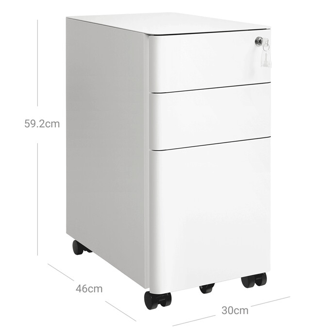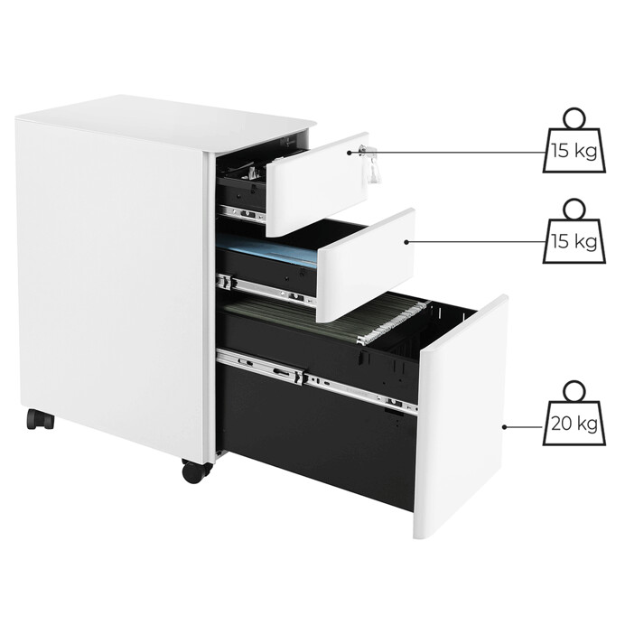 Pojazdné zásuvky v bielom prevedení sú vyrobené z pevného kovu, ktorý zabezpečuje stabilitu a dlhú životnosť. Kompaktná komoda ponúka tri zásuvky s hladkým výsuvom, pričom horná zásuvka je vybavená zámkom pre bezpečné uloženie dôležitých dokumentov alebo osobných vecí. Vďaka prídavným kolieskam je možné zásuvky ľahko presúvať podľa potreby, čo prispieva k flexibilite pracovného priestoru. Povrchová úprava v bielej farbe ladí s moderným kancelárskym interiérom a uľahčuje údržbu. Rozmery a praktické usporiadanie úložného priestoru umožňujú efektívnu organizáciu kancelárskych potrieb.