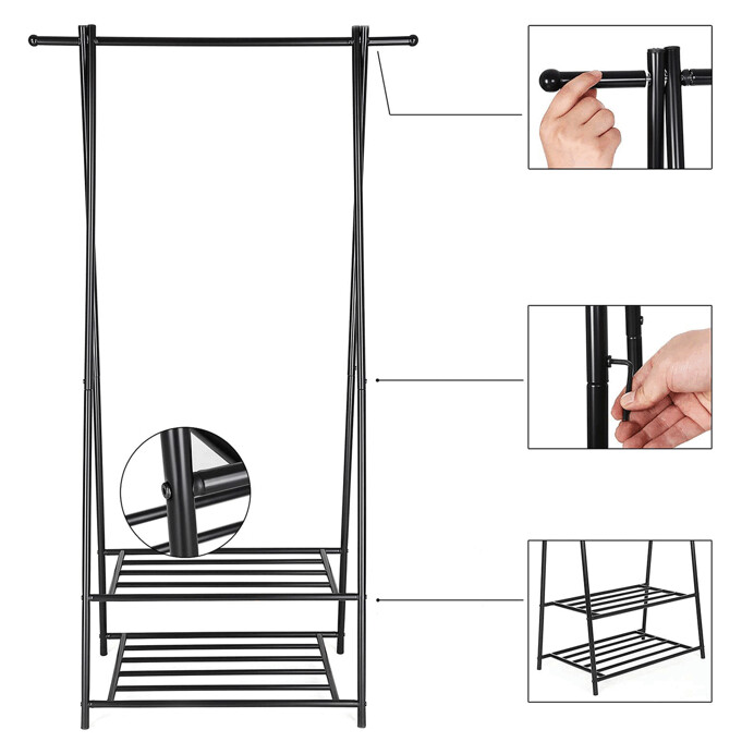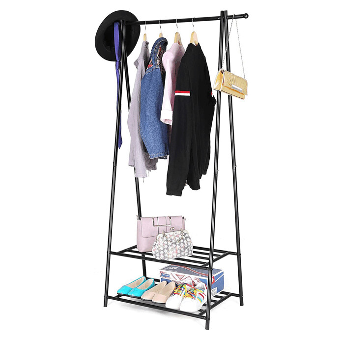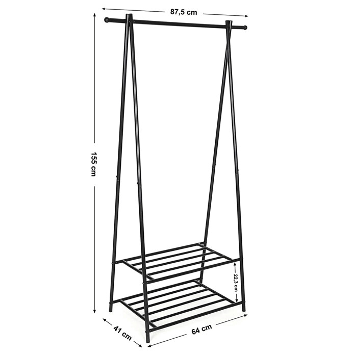 Kovový vešiak na šaty v čiernom prevedení ponúka praktické riešenie na usporiadanie odevov aj obuvi. Robustný rám je tvorený práškovo lakovanými trubkami, ktoré zabezpečujú stabilitu a dlhú životnosť. Vešiak je vybavený hornou tyčou na zavesenie oblečenia a dvoma policami s roštovou konštrukciou, ktoré umožňujú odkladanie topánok alebo ďalších doplnkov. Vďaka jednoduchému dizajnu a kompaktným rozmerom sa hodí do predsiení, spální aj šatní, kde pomáha udržať poriadok a prehľadnosť. Celková nosnosť zodpovedá pevnosti materiálu a konštrukcia umožňuje jednoduchú montáž aj údržbu.