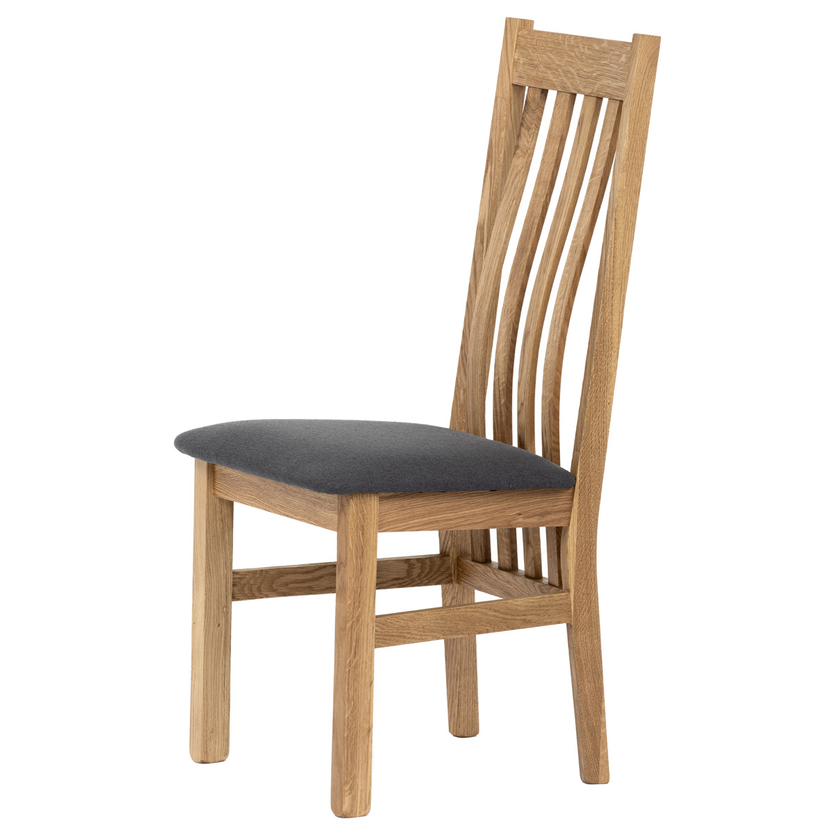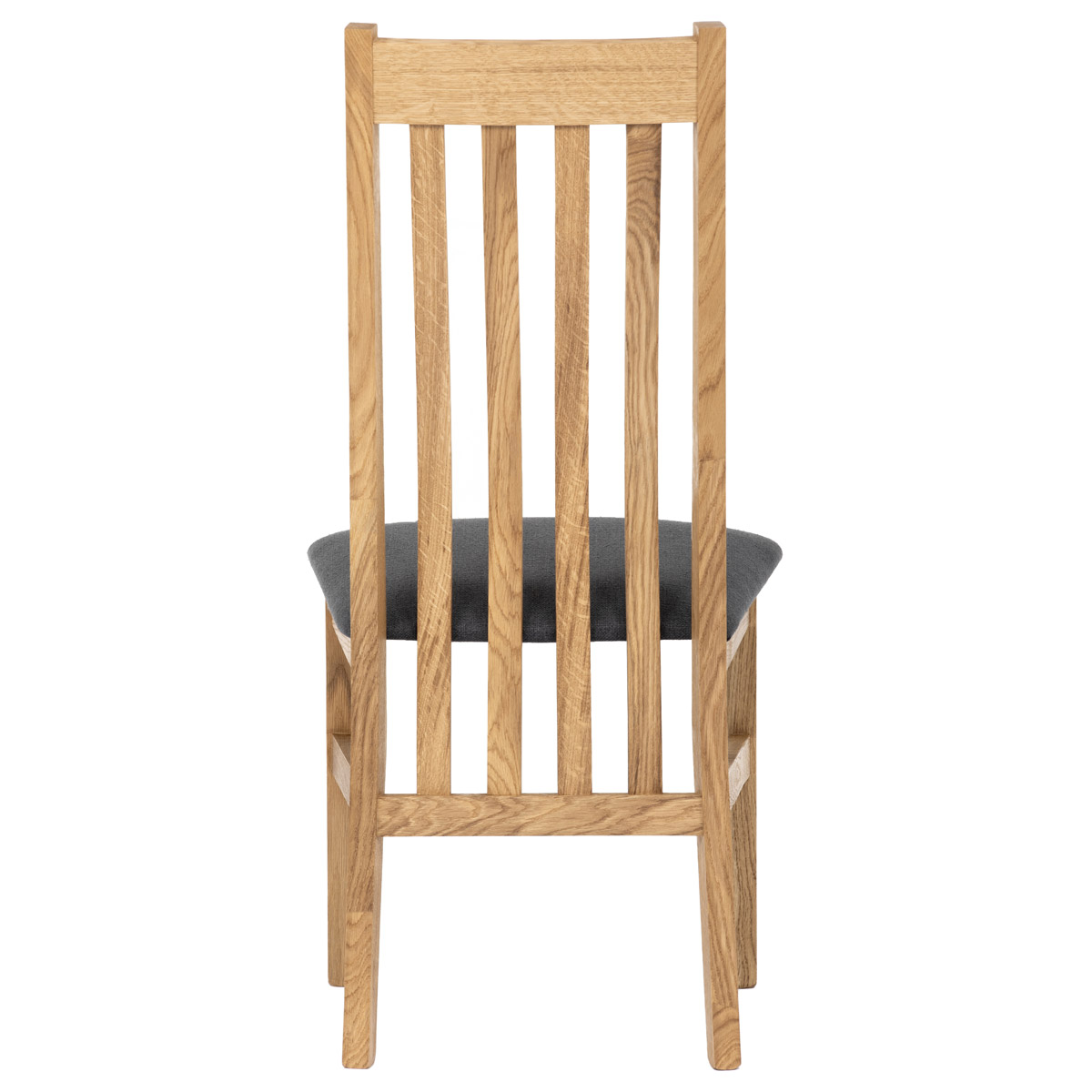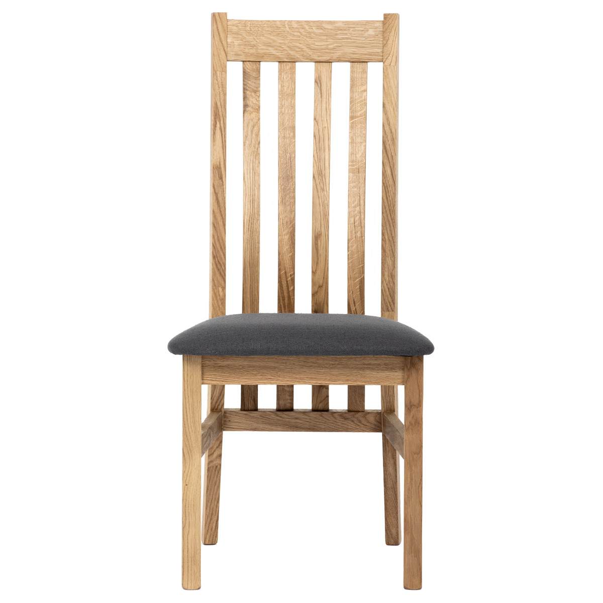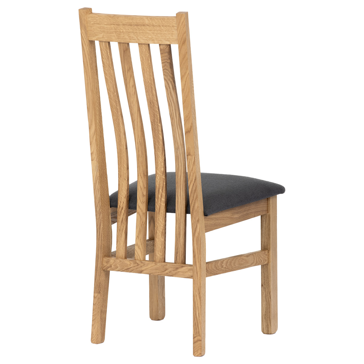Drevená jedálenská stolička z masívneho dubového dreva je demonštráciou dokonalej remeselnej práce. Zaujme nielen svojim rustikálnym štýlom, ale aj perfektným spracovaním. Štýl vychádza z minimalistického severského designu, v temnejšom nádychu prírodného odtieňa. Táto farebnosť skvele vykreslí roky duba a podčiarkne jej prevedenie. Čisté línie a vysoko kvalitné remeselné spracovanie dreveného masívu nastavuje očarujúce akcenty a podčiarkuje útulnú atmosféru v interiéri. Táto stolička Vás pozýva nielen na odpočinok, ale rozjímanie s rodinou i priateľmi, kde oceníte ergonomicky tvarované vzpery operadla, kopírujúce zakrivenie chrbtice. Pohodlný sedák je potiahnutý odolnou látkou z polyesterových vlákien, v antracitovo šedom farebnom odtieni. Polstrovanie je kvalitnou PU penou. O kvalite poťahovej látky Vás určite presvedčia jej parametre - gramáž 340 g/m2, martindale úplne skvelých 80 000 cyklov a farebná stálosť na svetle je na stupni 5. Povrchová úprava dubovej masívnej konštrukcie je tvrdovoskovým olejom, špeciálne určeným pre dlhodobé ošetrenie. Veľkým bonusom tejto stoličky je jej dodanie v kompletne zmontovanom stave a so spojmi lepenými (!). Tým odpadá nielen nepríjemné štúdium montážneho návodu a následne aj montáž, ale stolička bude stále pevná a nehrozí, že budete musieť v pravidelných cykloch uťahovať povolené skrutky. Ďalší pevnostný prvok slúži aj trnože medzi nohami. Toto všetko robí zo stoličky pevný a veľmi trvanlivý celok s nosnosťou až 140 kg. Elegantným prvkom bude v klasicky ladených interiéroch spoločne s masívnym dubovým stolom, ale aj kombinácia so stolom v štýle Loft bude veľmi zaujímavá a neprehliadnuteľná.