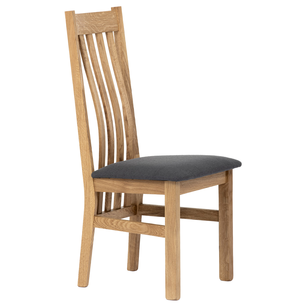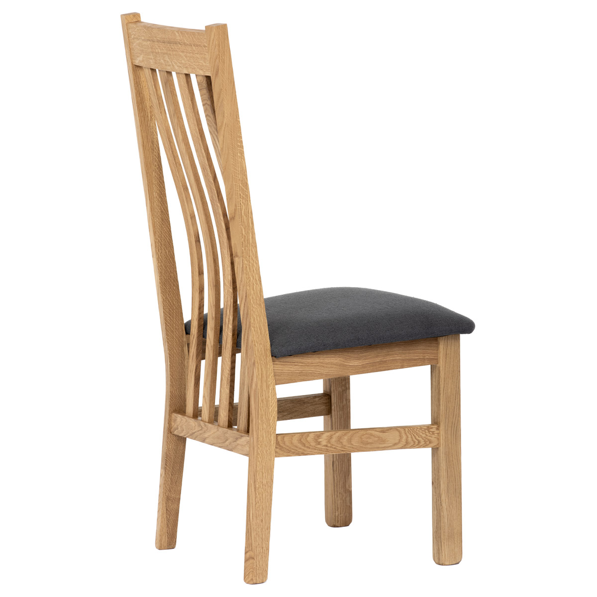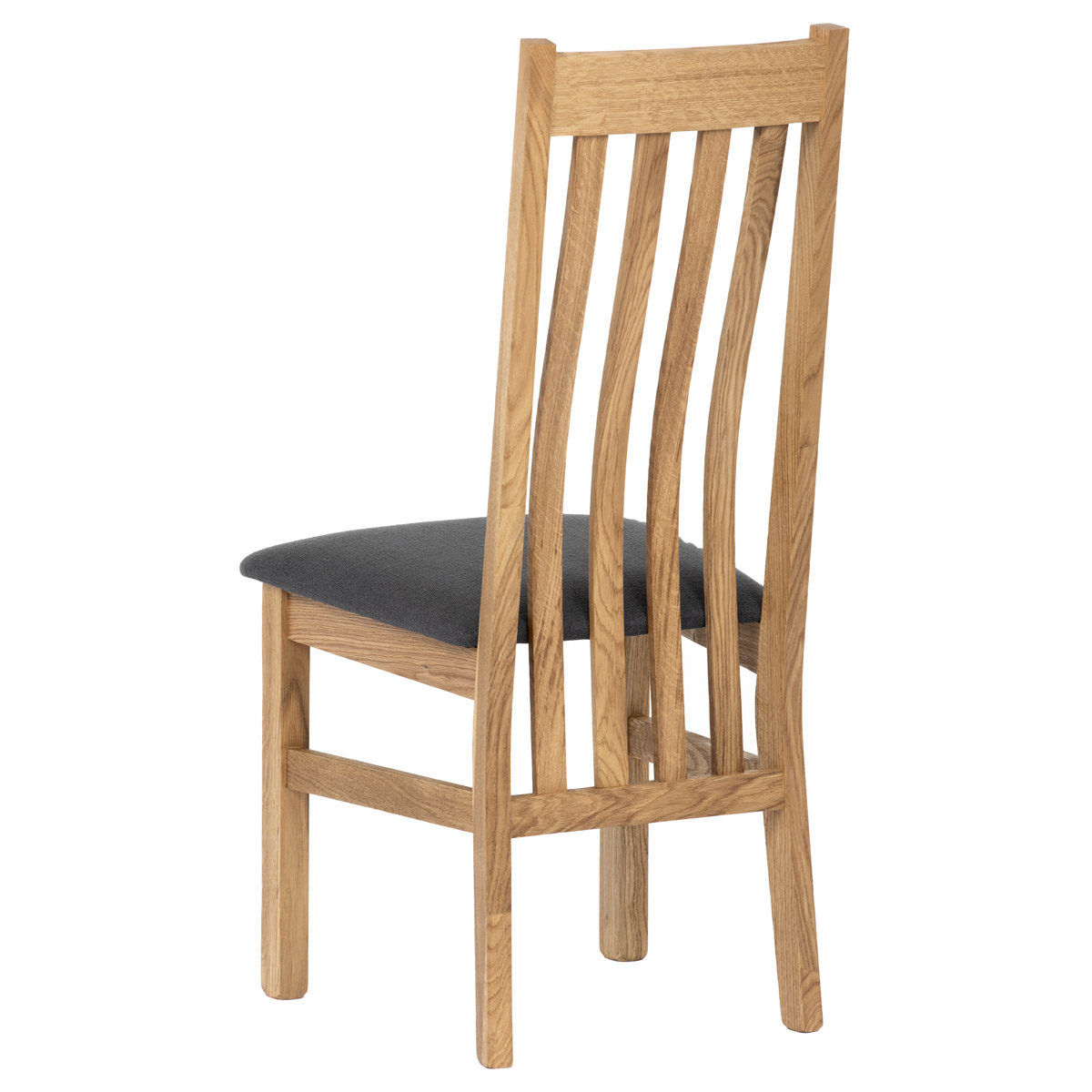 Drevená jedálenská stolička z masívneho dubového dreva je demonštráciou dokonalej remeselnej práce. Zaujme nielen svojim rustikálnym štýlom, ale aj perfektným spracovaním. Štýl vychádza z minimalistického severského designu, v temnejšom nádychu prírodného odtieňa. Táto farebnosť skvele vykreslí roky duba a podčiarkne jej prevedenie. Čisté línie a vysoko kvalitné remeselné spracovanie dreveného masívu nastavuje očarujúce akcenty a podčiarkuje útulnú atmosféru v interiéri. Táto stolička Vás pozýva nielen na odpočinok, ale rozjímanie s rodinou i priateľmi, kde oceníte ergonomicky tvarované vzpery operadla, kopírujúce zakrivenie chrbtice. Pohodlný sedák je potiahnutý odolnou látkou z polyesterových vlákien, v antracitovo šedom farebnom odtieni. Polstrovanie je kvalitnou PU penou. O kvalite poťahovej látky Vás určite presvedčia jej parametre - gramáž 340 g/m2, martindale úplne skvelých 80 000 cyklov a farebná stálosť na svetle je na stupni 5. Povrchová úprava dubovej masívnej konštrukcie je tvrdovoskovým olejom, špeciálne určeným pre dlhodobé ošetrenie. Veľkým bonusom tejto stoličky je jej dodanie v kompletne zmontovanom stave a so spojmi lepenými (!). Tým odpadá nielen nepríjemné štúdium montážneho návodu a následne aj montáž, ale stolička bude stále pevná a nehrozí, že budete musieť v pravidelných cykloch uťahovať povolené skrutky. Ďalší pevnostný prvok slúži aj trnože medzi nohami. Toto všetko robí zo stoličky pevný a veľmi trvanlivý celok s nosnosťou až 140 kg. Elegantným prvkom bude v klasicky ladených interiéroch spoločne s masívnym dubovým stolom, ale aj kombinácia so stolom v štýle Loft bude veľmi zaujímavá a neprehliadnuteľná.