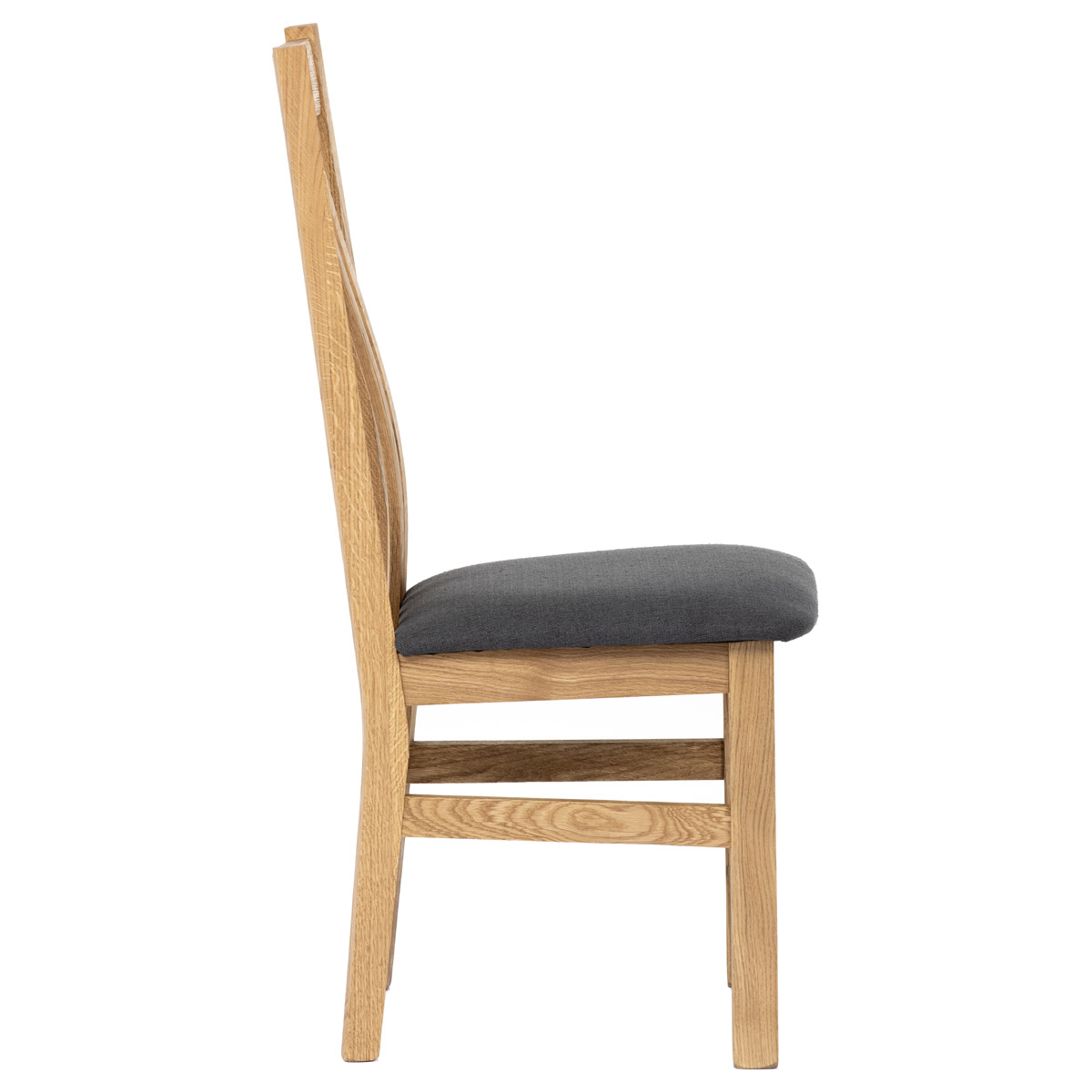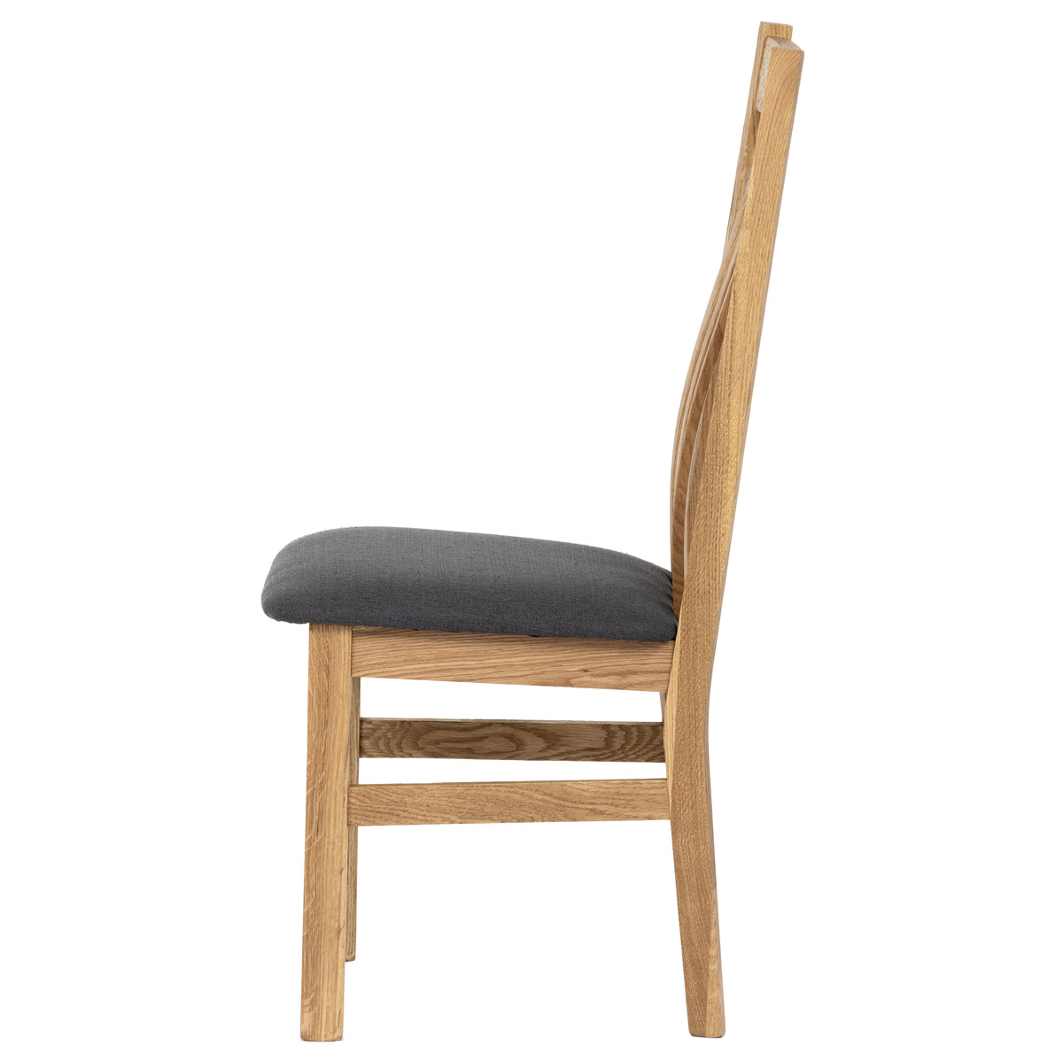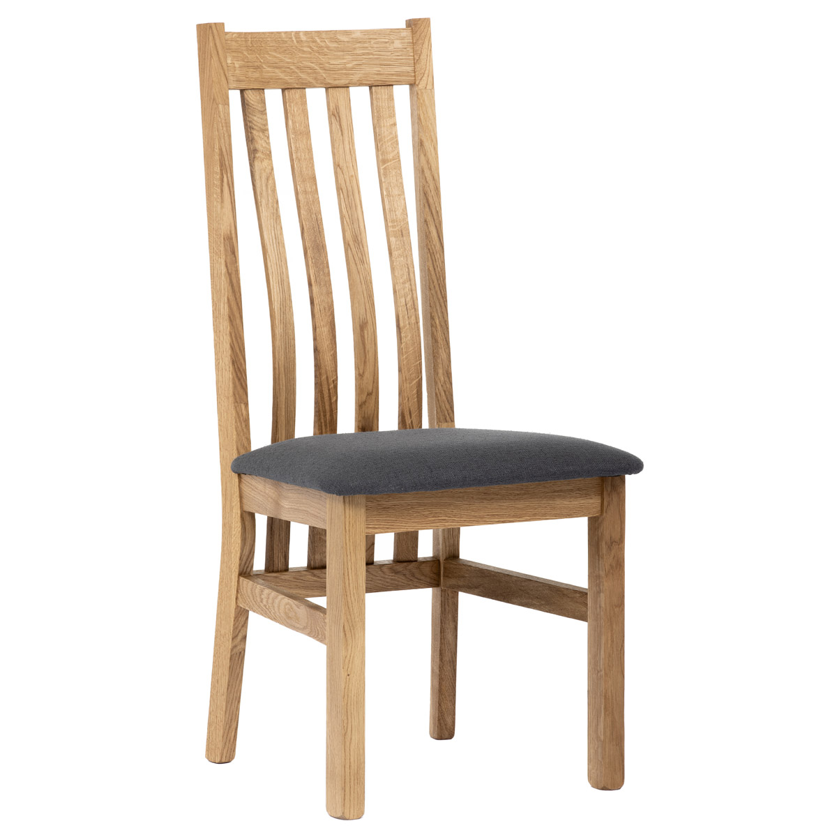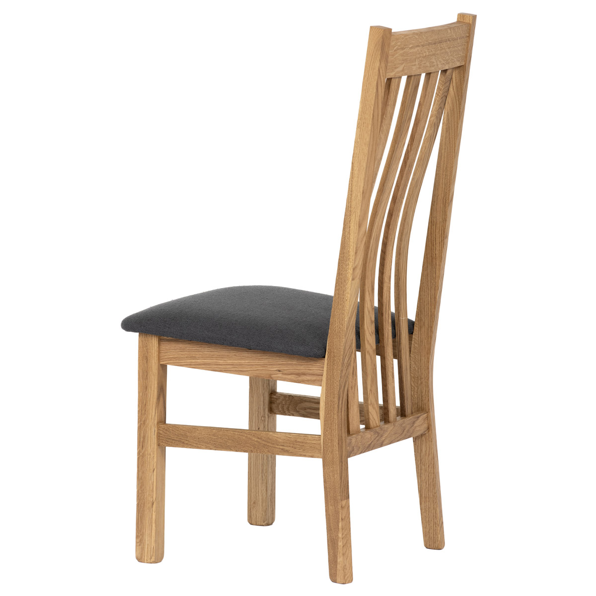 Drevená jedálenská stolička z masívneho dubového dreva je demonštráciou dokonalej remeselnej práce. Zaujme nielen svojim rustikálnym štýlom, ale aj perfektným spracovaním. Štýl vychádza z minimalistického severského designu, v temnejšom nádychu prírodného odtieňa. Táto farebnosť skvele vykreslí roky duba a podčiarkne jej prevedenie. Čisté línie a vysoko kvalitné remeselné spracovanie dreveného masívu nastavuje očarujúce akcenty a podčiarkuje útulnú atmosféru v interiéri. Táto stolička Vás pozýva nielen na odpočinok, ale rozjímanie s rodinou i priateľmi, kde oceníte ergonomicky tvarované vzpery operadla, kopírujúce zakrivenie chrbtice. Pohodlný sedák je potiahnutý odolnou látkou z polyesterových vlákien, v antracitovo šedom farebnom odtieni. Polstrovanie je kvalitnou PU penou. O kvalite poťahovej látky Vás určite presvedčia jej parametre - gramáž 340 g/m2, martindale úplne skvelých 80 000 cyklov a farebná stálosť na svetle je na stupni 5. Povrchová úprava dubovej masívnej konštrukcie je tvrdovoskovým olejom, špeciálne určeným pre dlhodobé ošetrenie. Veľkým bonusom tejto stoličky je jej dodanie v kompletne zmontovanom stave a so spojmi lepenými (!). Tým odpadá nielen nepríjemné štúdium montážneho návodu a následne aj montáž, ale stolička bude stále pevná a nehrozí, že budete musieť v pravidelných cykloch uťahovať povolené skrutky. Ďalší pevnostný prvok slúži aj trnože medzi nohami. Toto všetko robí zo stoličky pevný a veľmi trvanlivý celok s nosnosťou až 140 kg. Elegantným prvkom bude v klasicky ladených interiéroch spoločne s masívnym dubovým stolom, ale aj kombinácia so stolom v štýle Loft bude veľmi zaujímavá a neprehliadnuteľná.