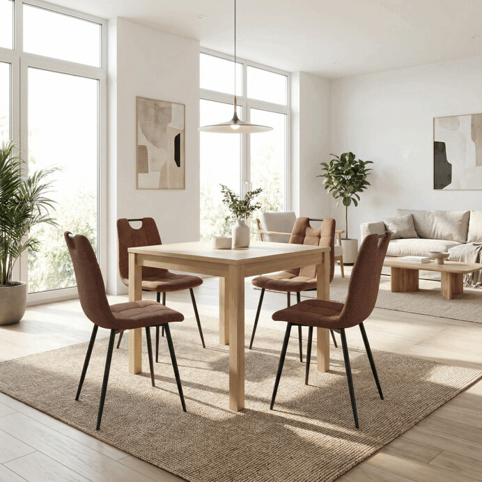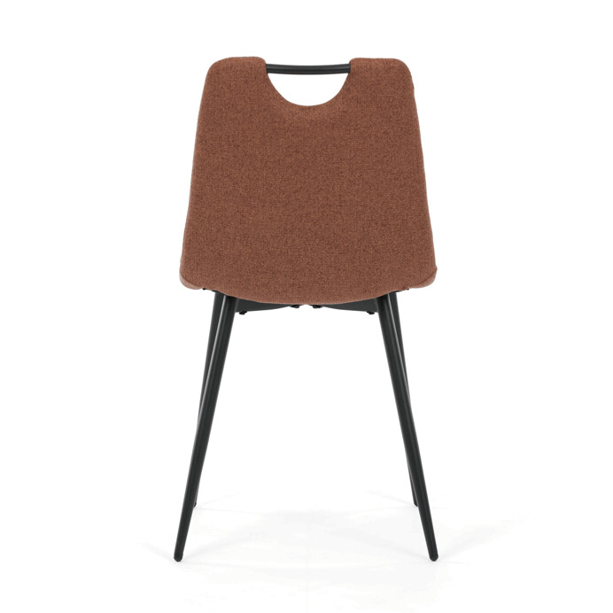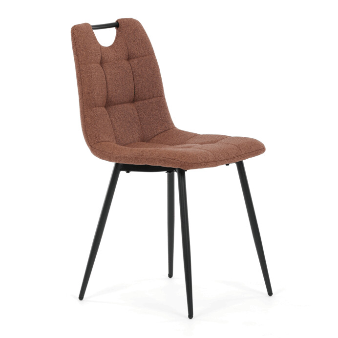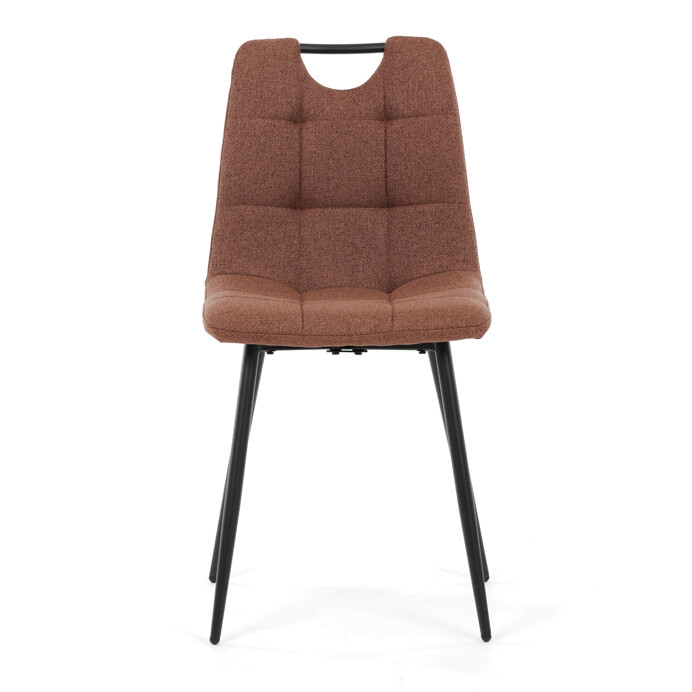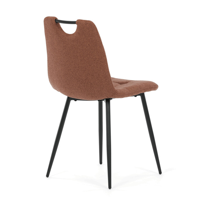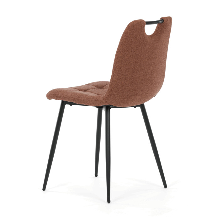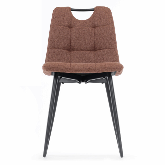 Jedálenská stolička DCL-V2017 BR2 kombinuje pohodlie s praktickým dizajnom vhodným do moderných interiérov. Sedák a operadlo sú potiahnuté hnedou látkou, ktorá sa ľahko udržiava a je doplnená dizajnovým prešívaním pre zvýraznenie estetického dojmu. Čierne matné kovové nohy zabezpečujú stabilitu a pevnosť celej stoličky, zatiaľ čo madlo v hornej časti operadla uľahčuje manipuláciu a prenášanie. Absencia podrúčok umožňuje väčšiu variabilitu usporiadania pri jedálenskom stole. Stolička je navrhnutá tak, aby poskytovala komfortné sedenie s dôrazom na jednoduchú údržbu a dlhú životnosť.