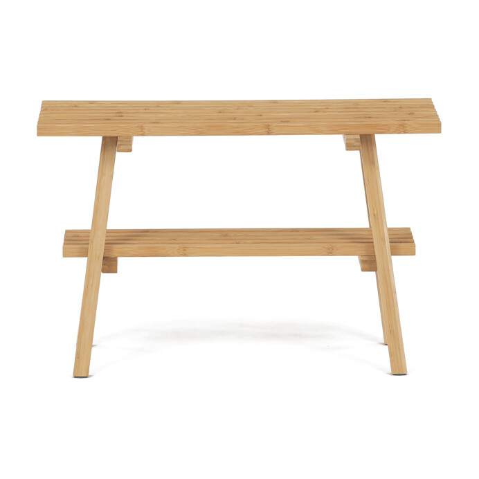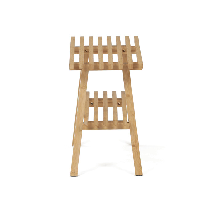 Botník z masívneho bambusu v prírodnom odtieni ponúka praktické a estetické riešenie na usporiadanie obuvi v domácnosti. Jeho jednoduchý dizajn s jednou policou tvorenou vodorovnými latkami umožňuje efektívne vetranie a rýchle schnutie obuvi. Stabilné nohy mierne rozšírené do strán zabezpečujú pevnosť a bezpečnosť pri používaní. Povrchová úprava bambusu podčiarkuje jeho prírodný vzhľad a zároveň uľahčuje údržbu. Vďaka kompaktným rozmerom je botník vhodný do predsiení aj menších priestorov.
