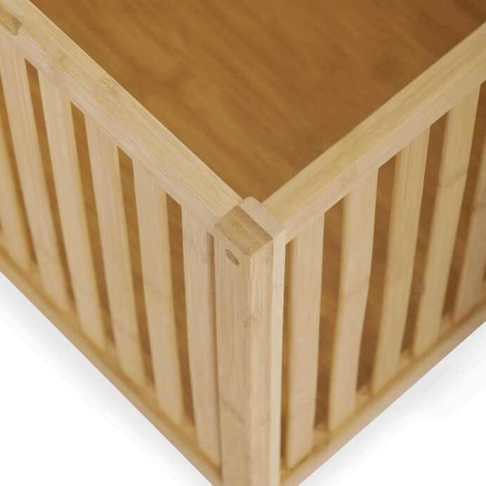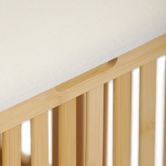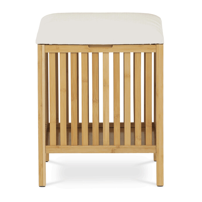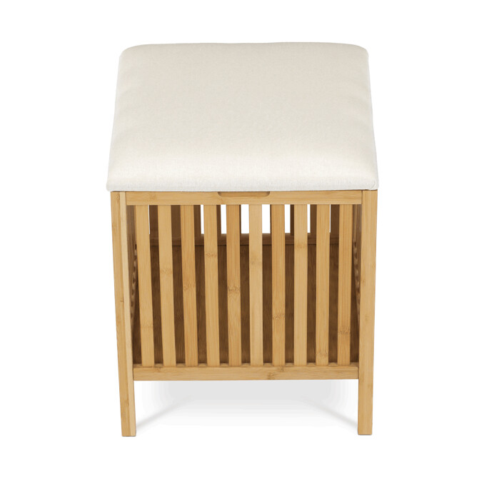 Kôš na bielizeň z masívneho bambusu v prírodnom odtieni kombinuje praktický úložný priestor s možnosťou sedenia vďaka polstrovanému sedáku v jemnej bielej farbe. Bambusové lamely tvoria pevnú a vzdušnú základňu, ktorá umožňuje cirkuláciu vzduchu vo vnútri koša. Polstrovaný sedák je potiahnutý látkou, ktorá sa ľahko udržiava a zvyšuje komfort pri sedení. Vďaka svojmu prírodnému vzhľadu sa hodí do rôznych interiérov, kde prináša prírodnú atmosféru a funkčnosť v jednom.